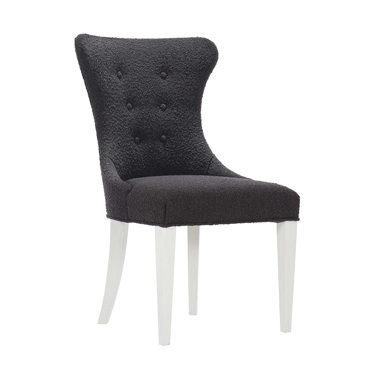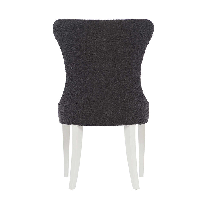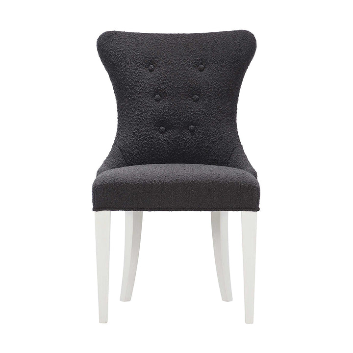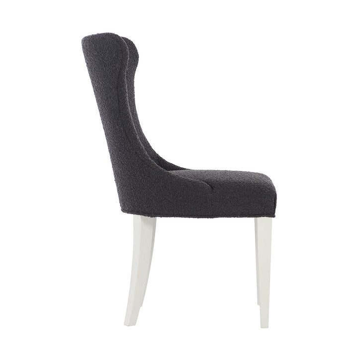 This side chair is not only utilitarian but also comfy and stylish. It features a shapely structure entirely upholstered in soft fabric with button details on the innerback for a rich look. This piece rests opulently on tapered legs coated in an Eggshell finish, accentuating the overall design effortlessly.