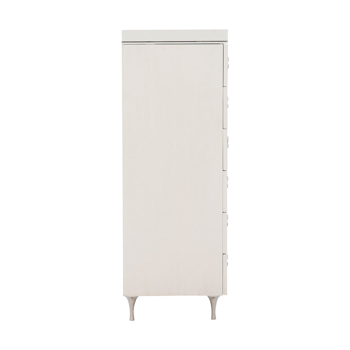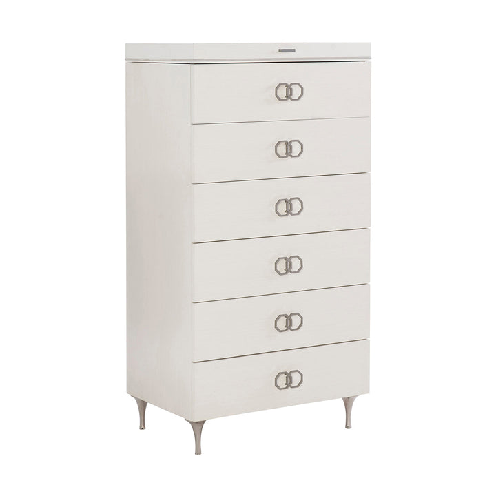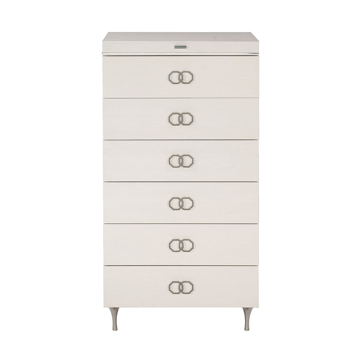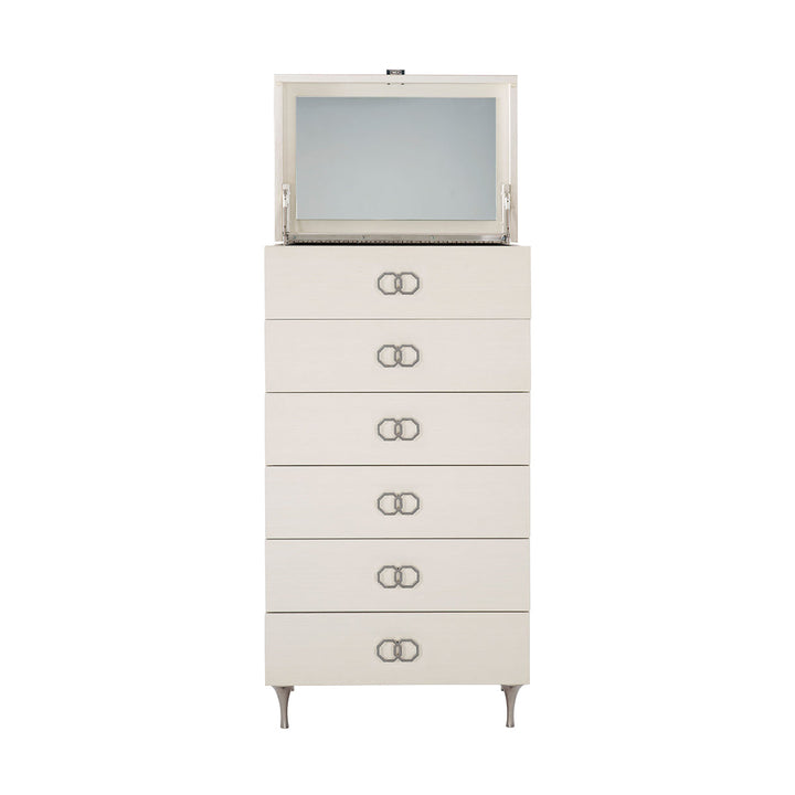Minimal dresser takes a modern turn in Eggshell finish. A tall, clean-lined form houses six roomy soft-closing drawers, beautifully securing your belongings. Subtle details include interlocking Polished Stainless Steel octagon-shaped hardware and a lift-up mirrored lid that reveals a Black felt-lined jewelry tray. Four chic legs keep it steady and bring in a plush appeal.
