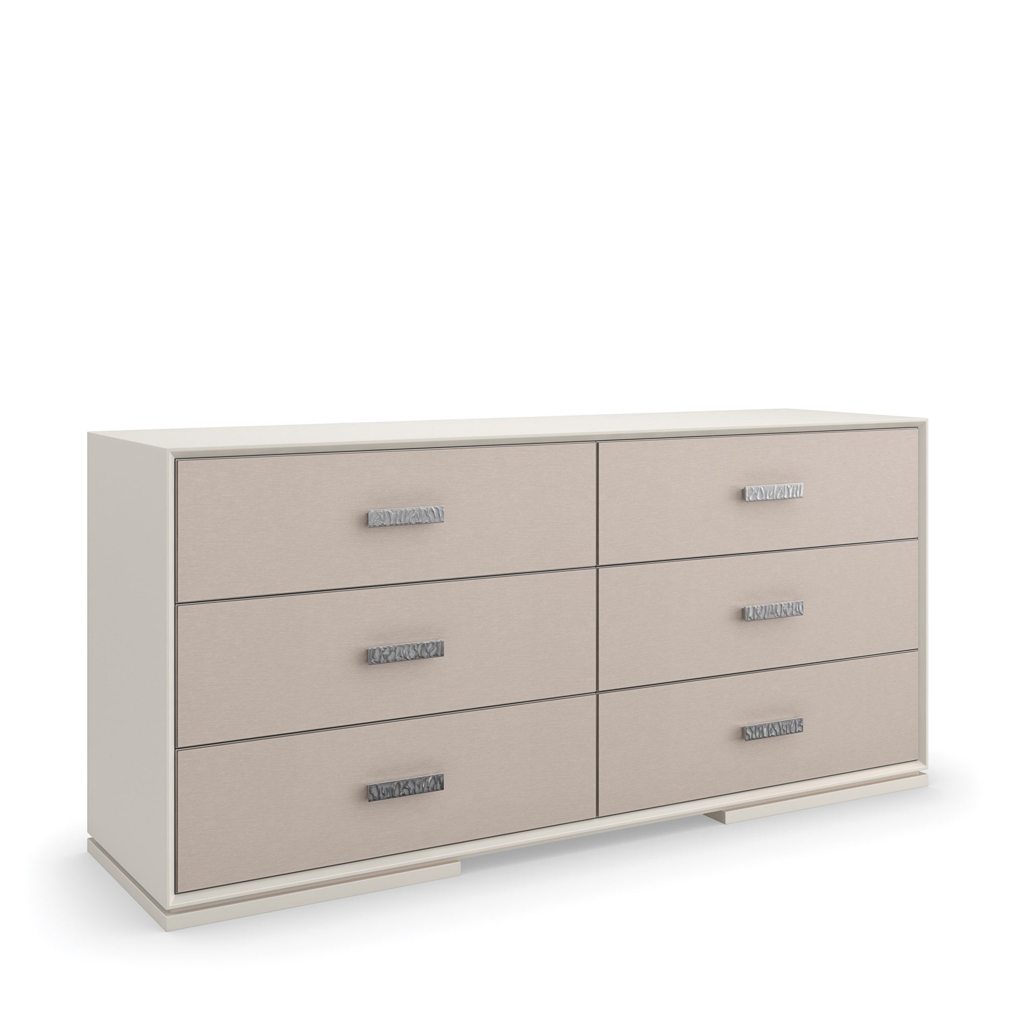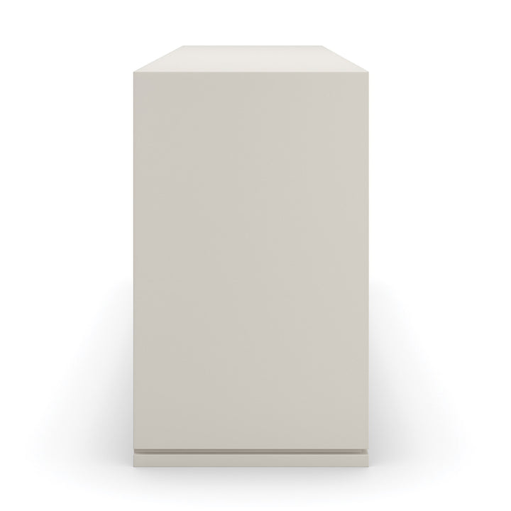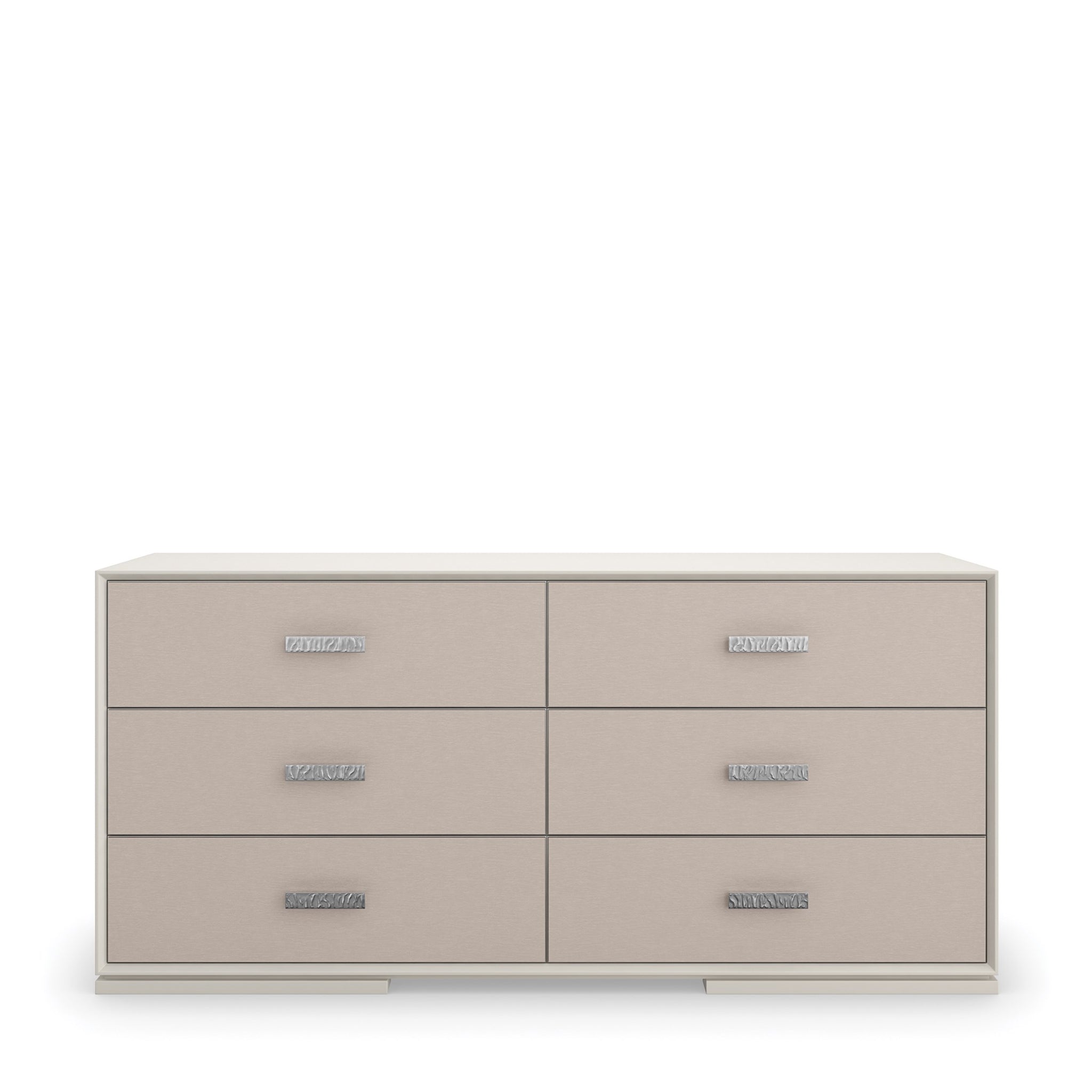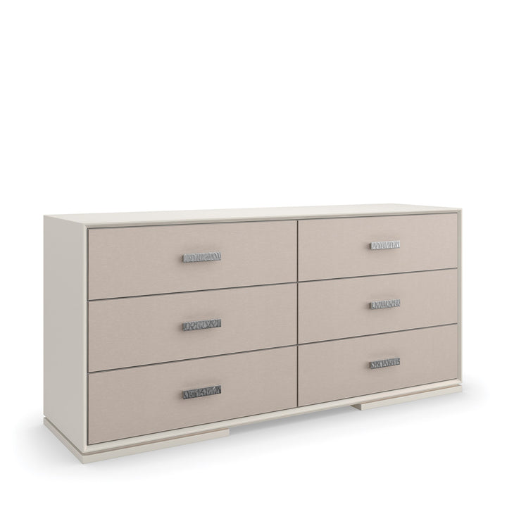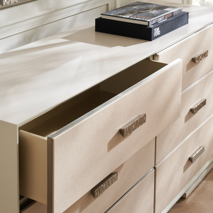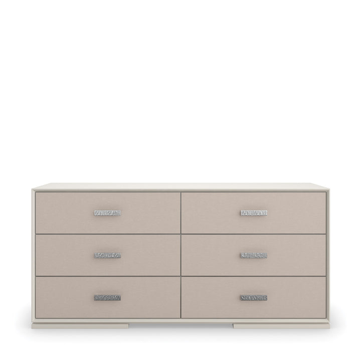 Liven up your space with the Silver Lining Dresser – a vision of modern sophistication. This dresser oozes modern charm with its refreshing Almond Milk finish and stylish Brushed Stainless metal accent. Its six drawers mix elegance and functionality with vinyl-wrapped fronts and soft-close undermount guides. A hint of elegance is added by the UV Linen drawer interior. Make a statement in your home with this cutting-edge piece that flawlessly integrates form and function.