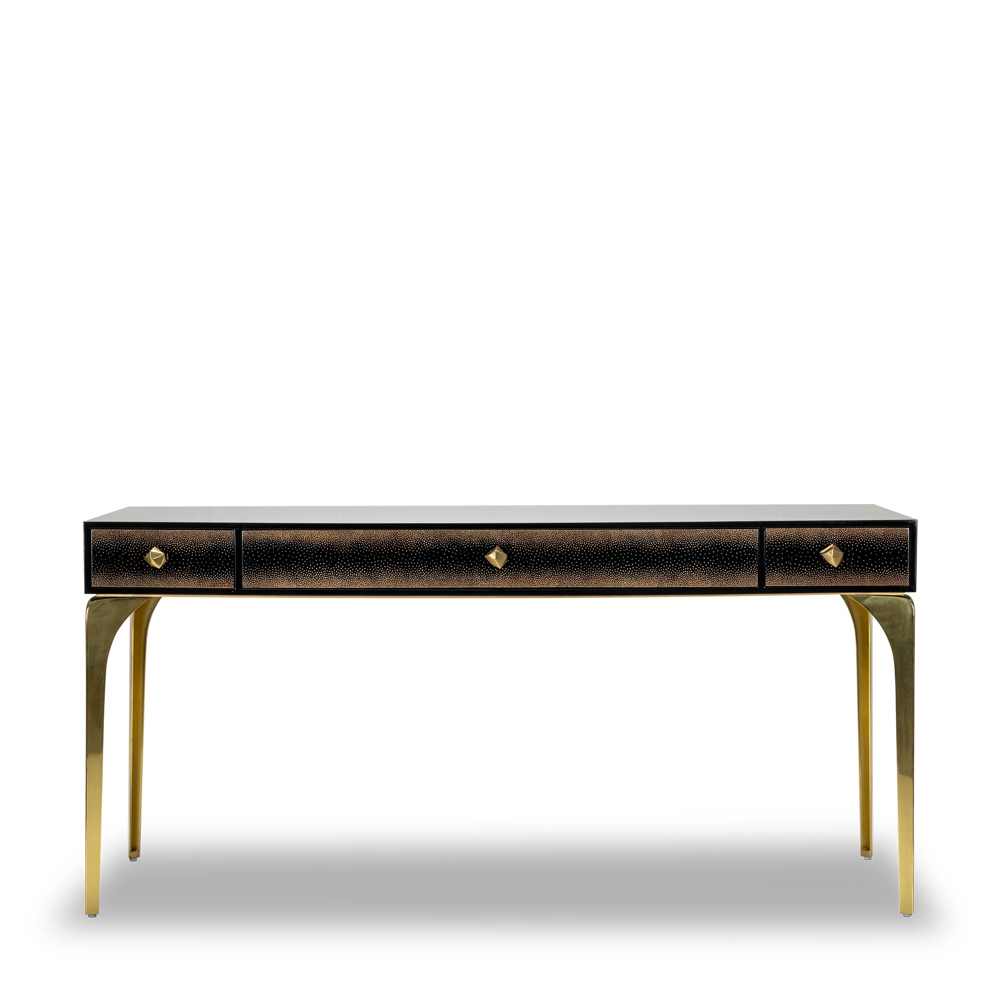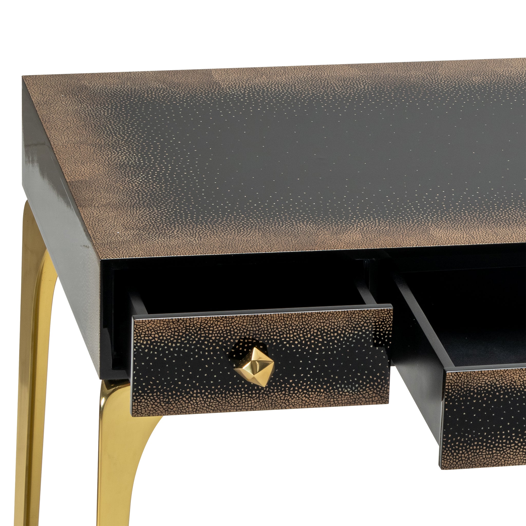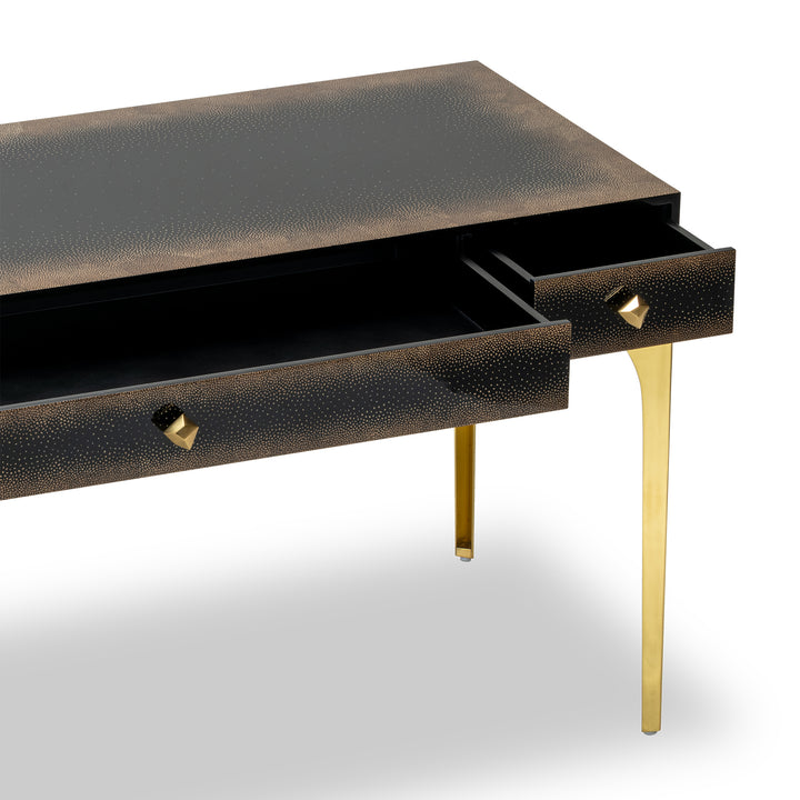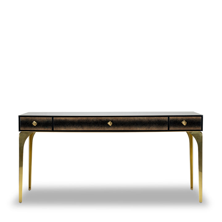 The study desk presents a harmonious blend of utility and artistry, defined by its hand-applied eggshell inlay. Crafted with precision and perfected by a 10-step lacquer process, the surface glows with radiance and lasting sophistication.