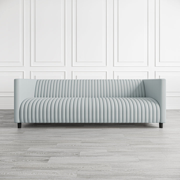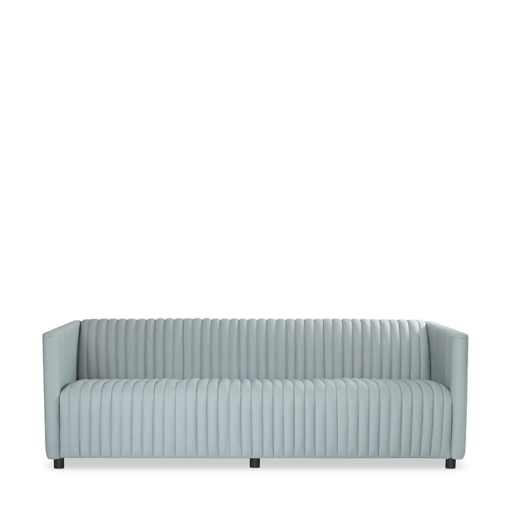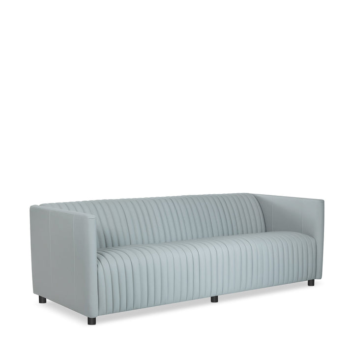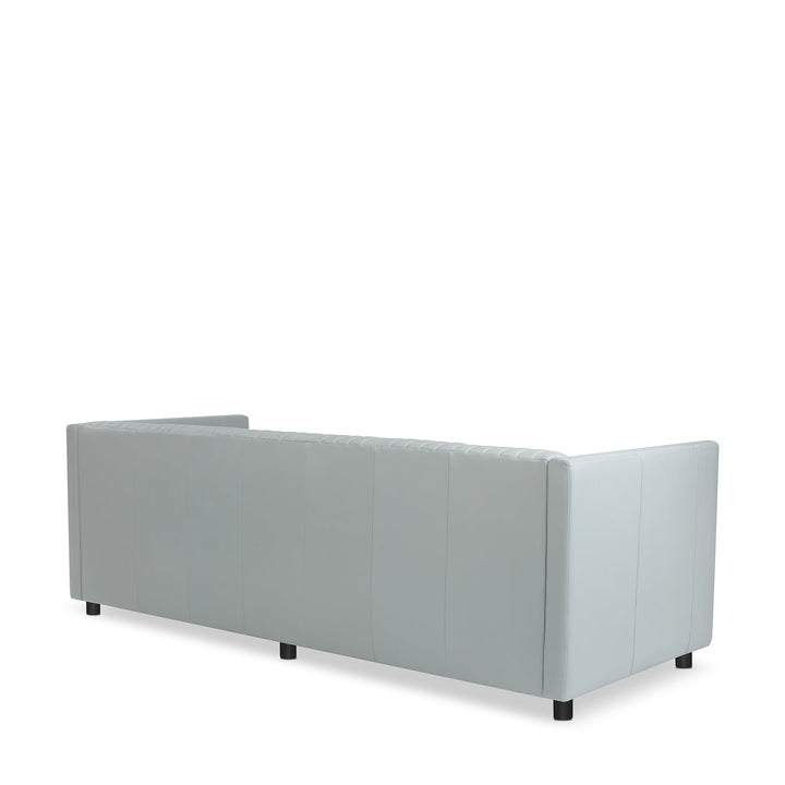 The photogenic sofa will shower elegance and sophistication to your living space. Featuring a slender wooden composition, it dolls up in Grey Leather fabric, provides ample seating, and assures utmost comfort. Vertical channel stitching and tufting on its inner back and seat appear delicate and luxe. Completing its refined look are the well-built wooden legs in a Black finish.