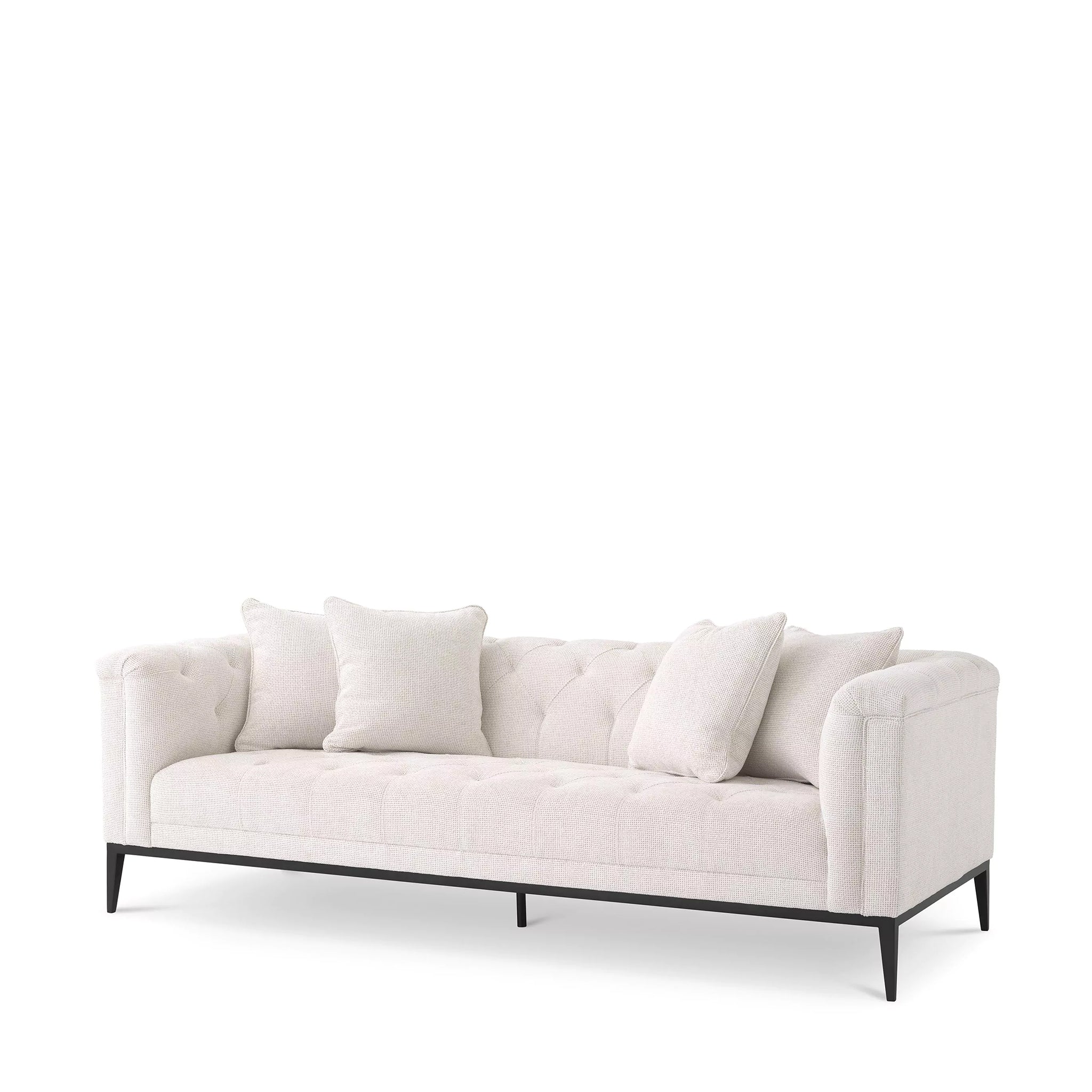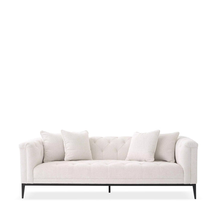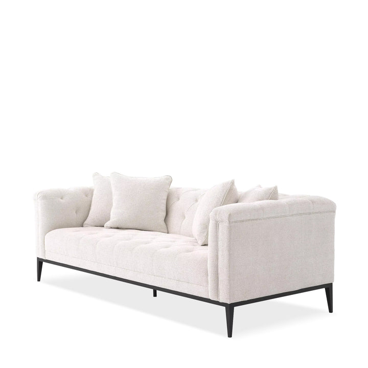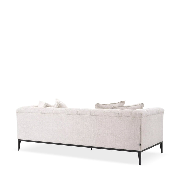 Taking a modern interpretation of the classic Chesterfield, this piece flaunts a slender form in Lyssa Off-White fabric to lend a smooth texture. Its aesthetic appeal is enhanced by a delicate button-tufting pattern and straight-line embroidered stitching. Four throw pillows wrapped in the same material add an inviting and homely touch, and it fits nicely atop a Gunmetal-finished base for a clean and sturdy look.