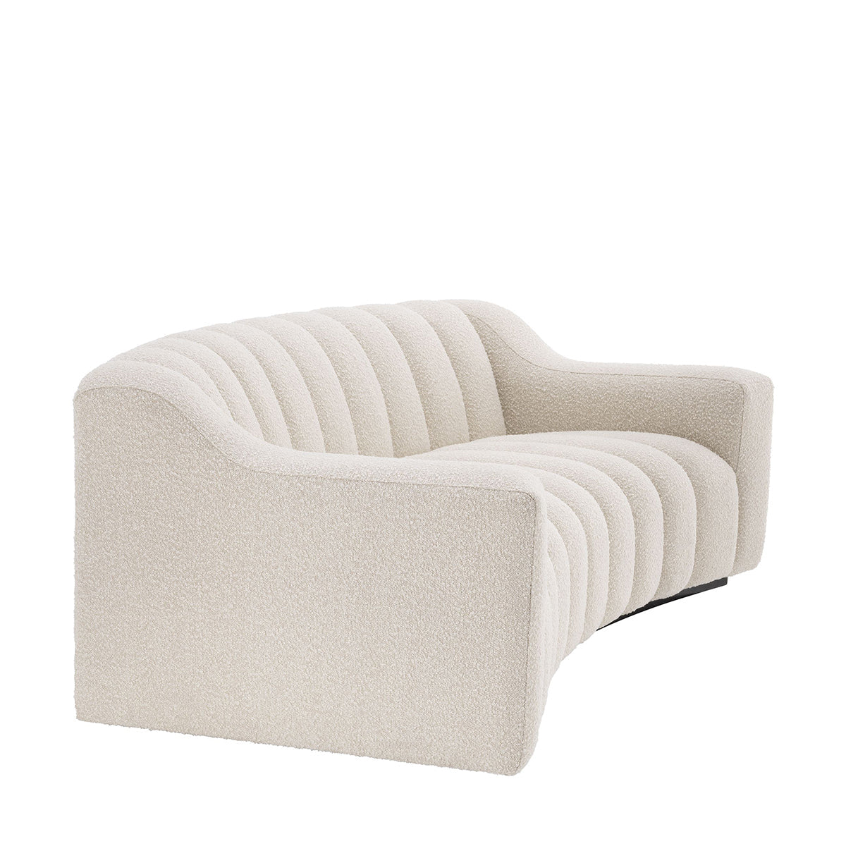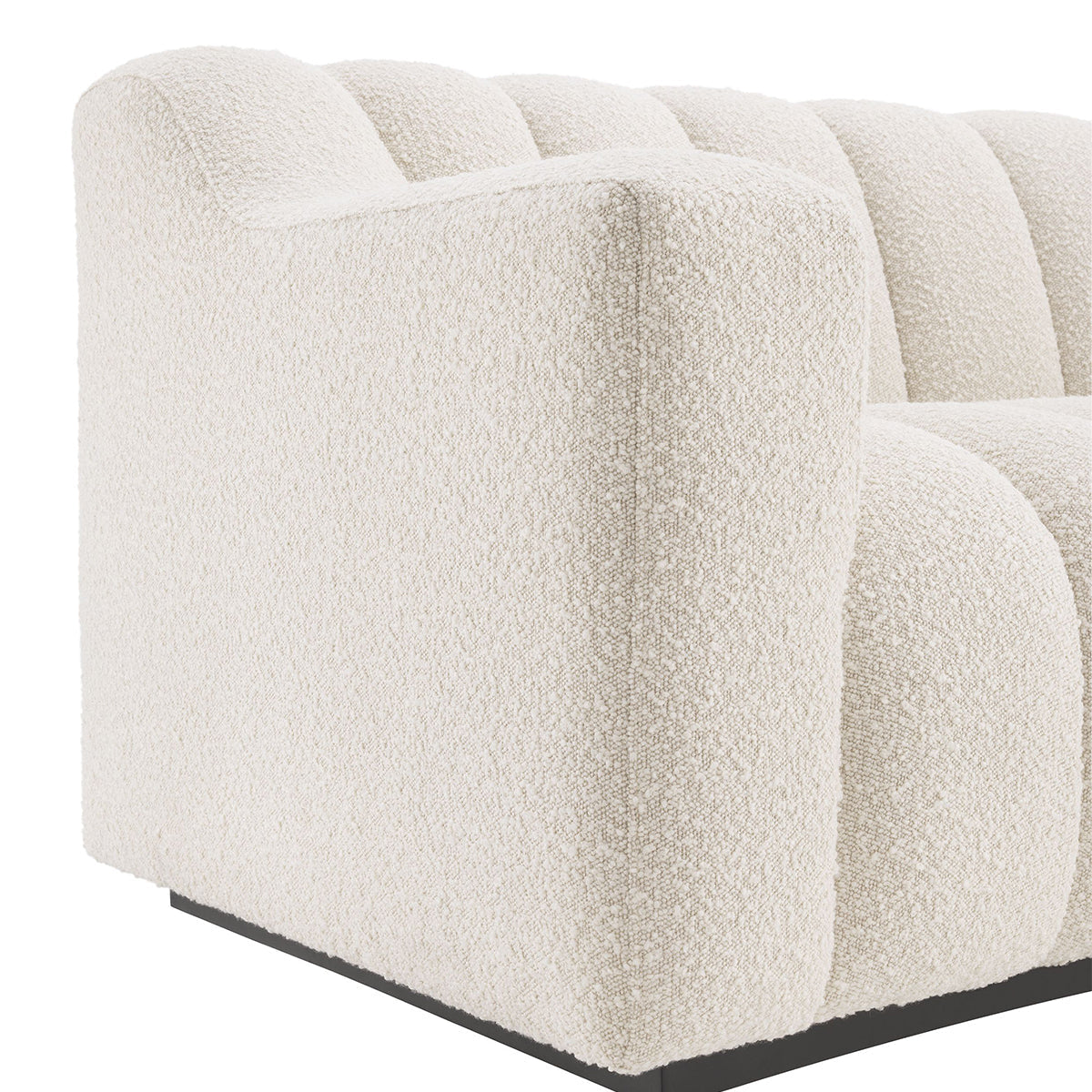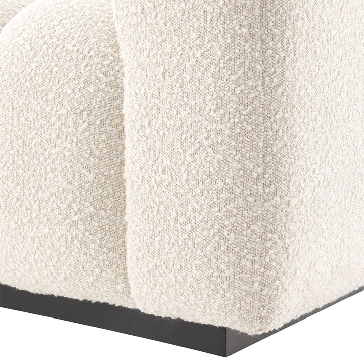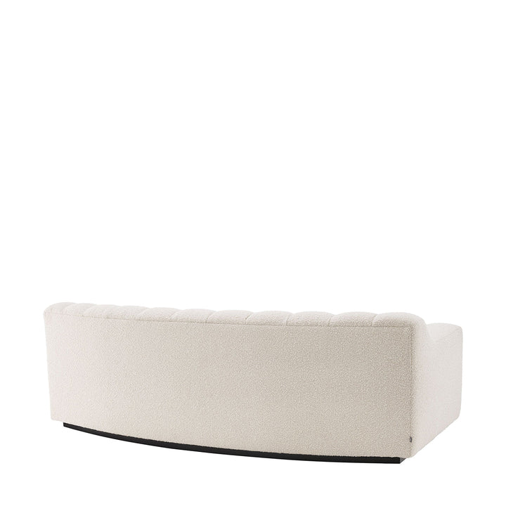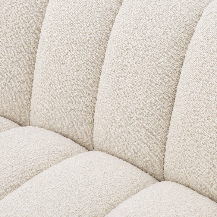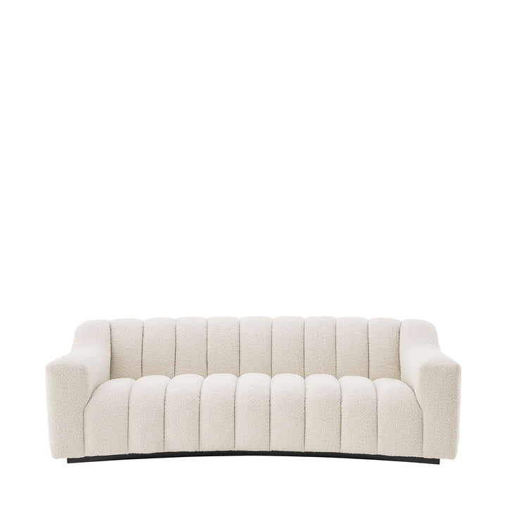 The inviting and eye-catching Kelly S Sofa will undoubtedly make a bold statement in your home's interior. Boucle Cream upholstery with lovely vertical channel tufting offers a sleek and on-trend look. It rests on a continuous black-colored base complementing its design perfectly.