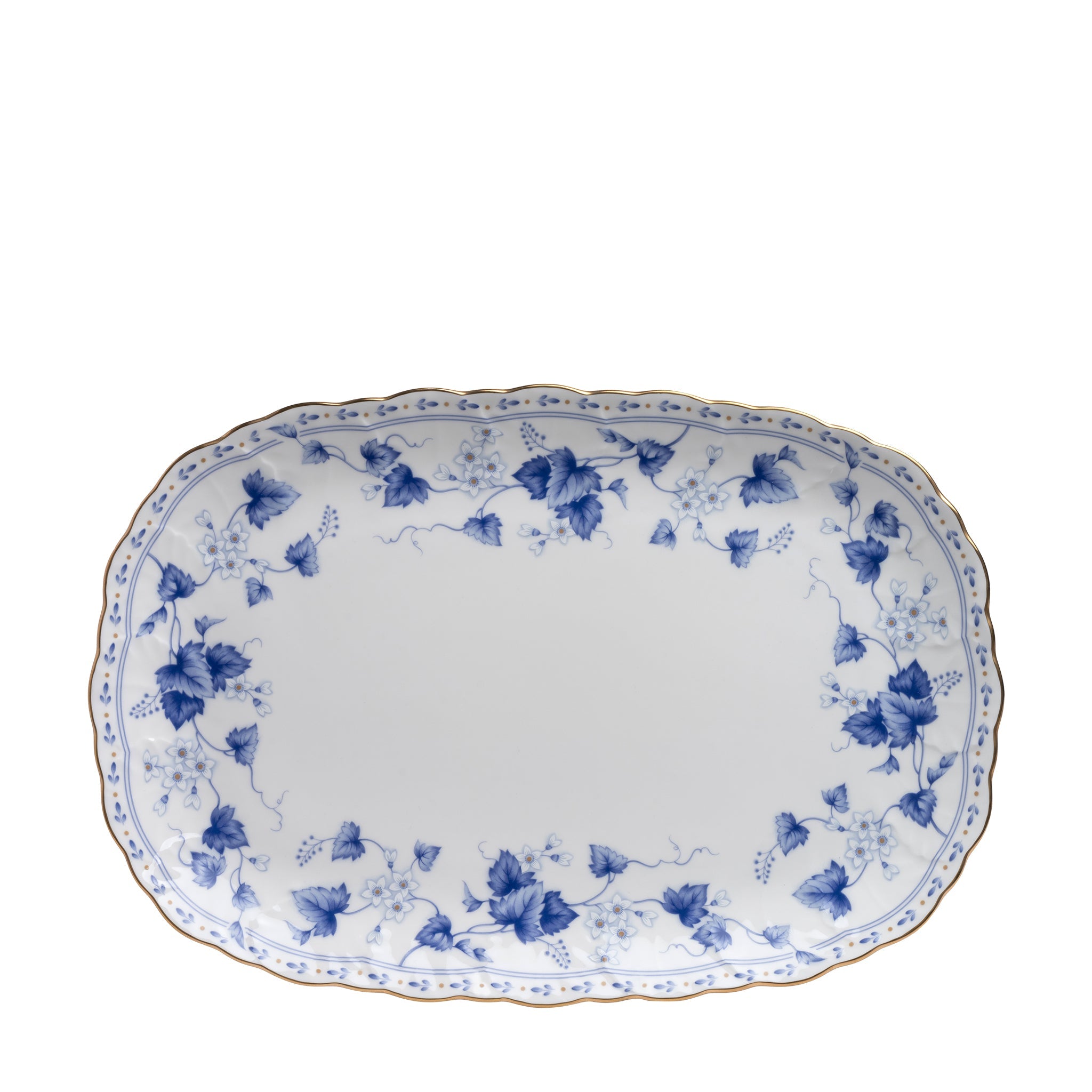 Embrace the fusion of artistry and practicality with the Solaria 38cm Oval Platter - where timeless design meets impeccable craftsmanship. It is constructed in White Bone China, with a delicate floral pattern in a Blue accent for a fresh, nature-inspired look. The wavy rim in golden rounds out the white and blue aesthetics.