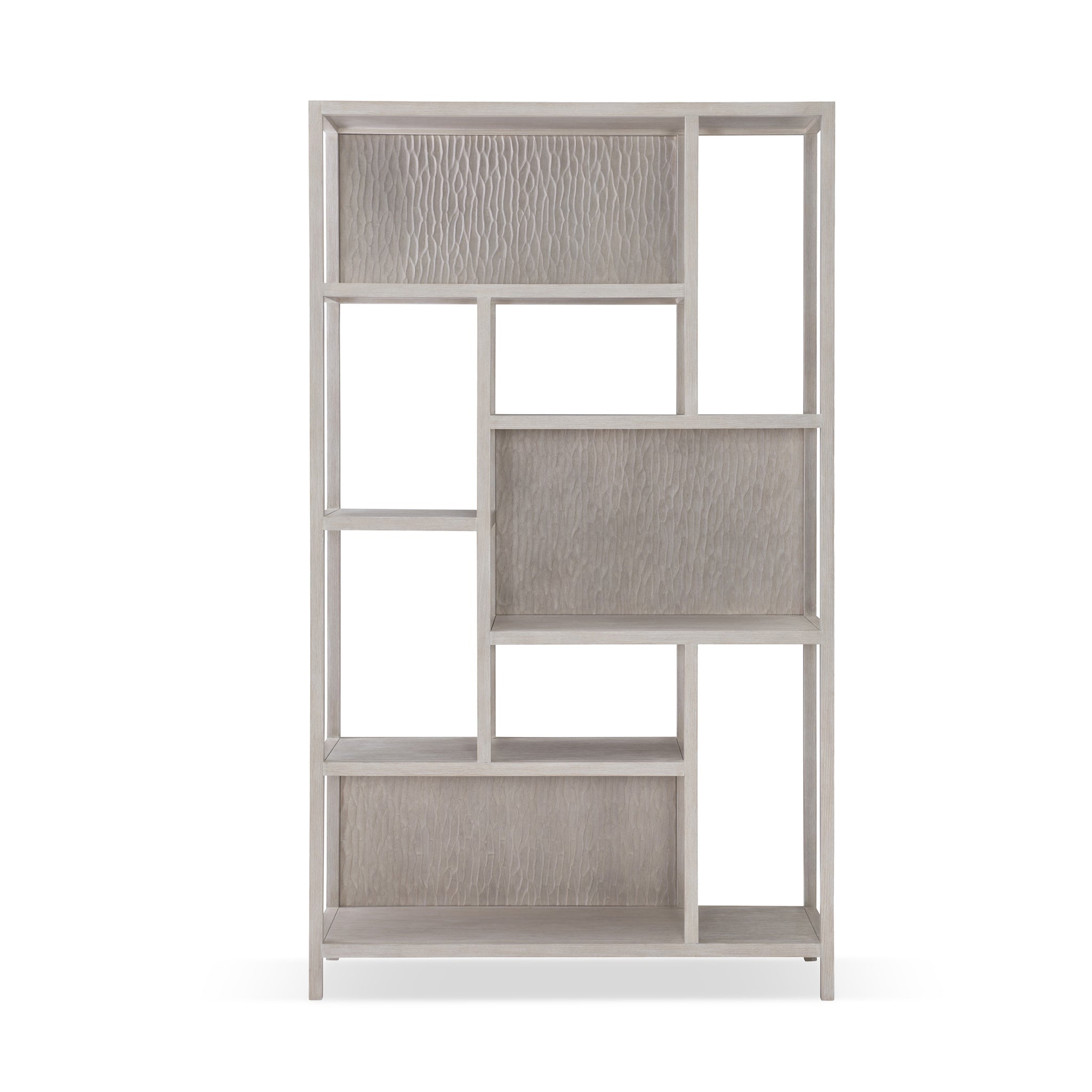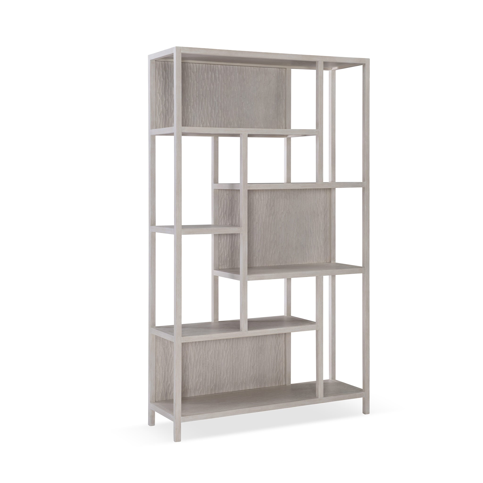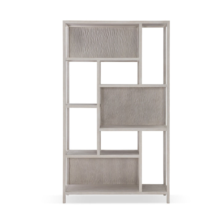 Crafted with excellence, this etagere will display your prized collections in elegance. It has an open, airy wooden frame with Staggered Cast Resin back panels that flaunt a Chiseled pattern design, adding visual interest. Offering six wooden shelves, the Solaria Etagere is bathed in a Weathered Bone finish to radiate a vintage vibe in your home furnishings.
