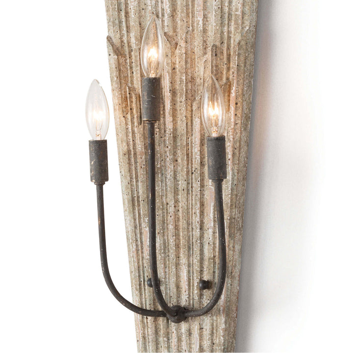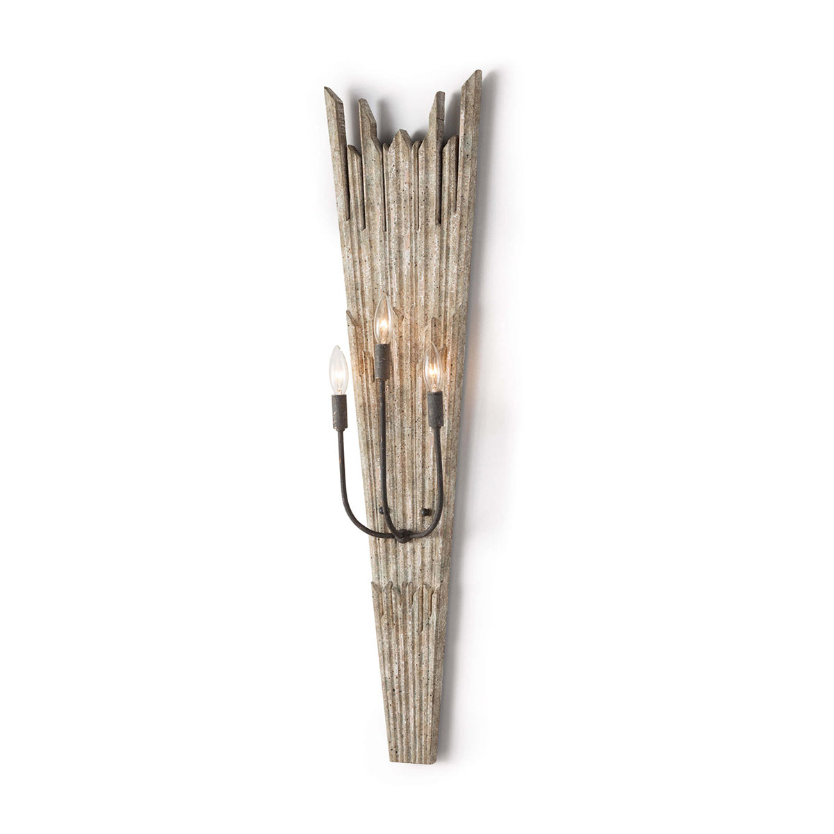 Light up your space with this classic wall lamp, featuring a wooden structure in a Distressed Painted finish that looks like a beam of sunlight. It showcases a trio of Rustic Iron stems that carry Candelabra bulbs to cast a soothing illumination on your home decor. Hang these as a pair to create a supreme look.