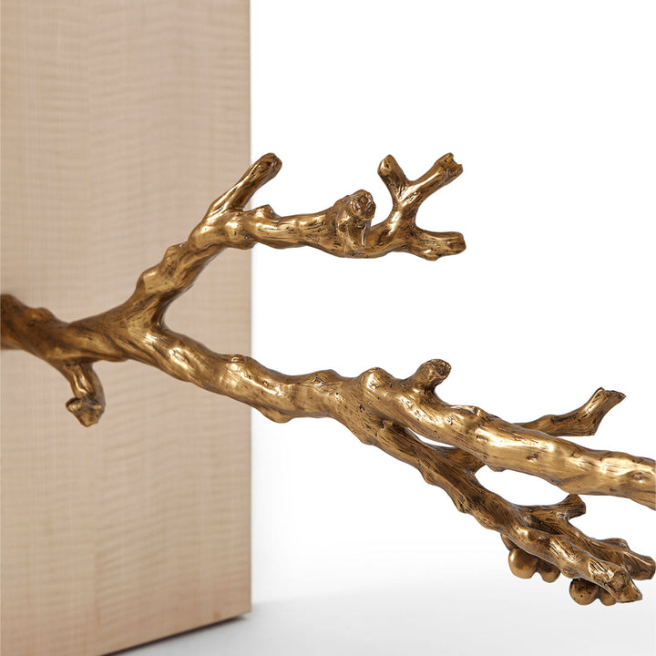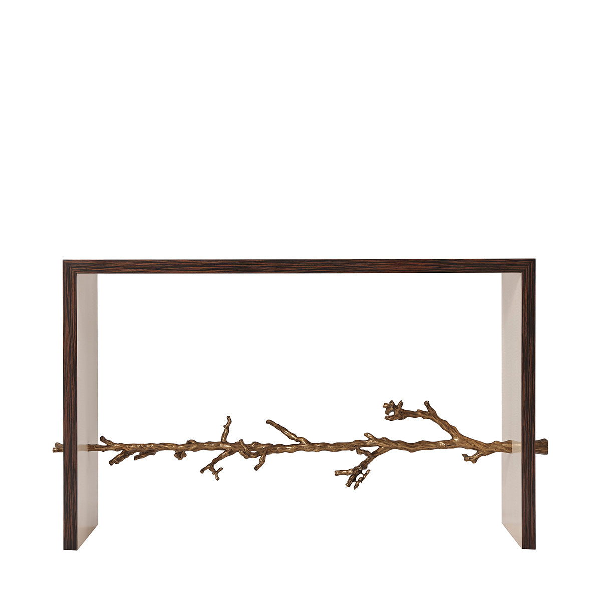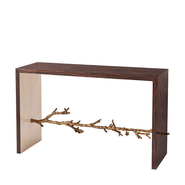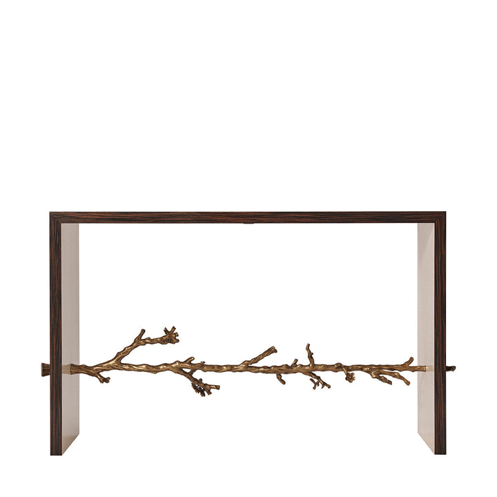 Transform your living spaces with this artistically crafted console table, which brings regal ethnicity. The Art deco combo is refreshing in natural Ebony wood paired with a forest-inspired cast flowering branch stretcher. Contemporary characteristics of the fiddled back Sycamore interior unit bring a harmonious vibe.