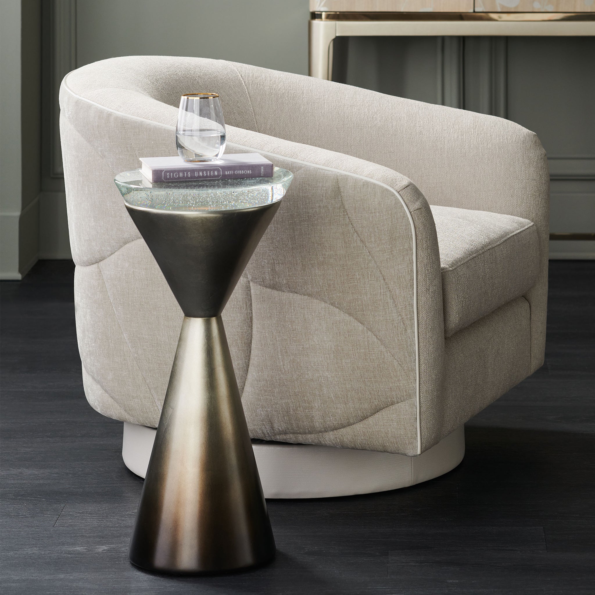 Style up your home decor with this accent table—showcasing an hourglass shape crafted in metal with an Ombre Leaf finish and shimmering silver leaf finishes. A bevel-cut Bubble Glass top adds sparkle to its composition. This piece will fit in any setting, thanks to its luxurious design.