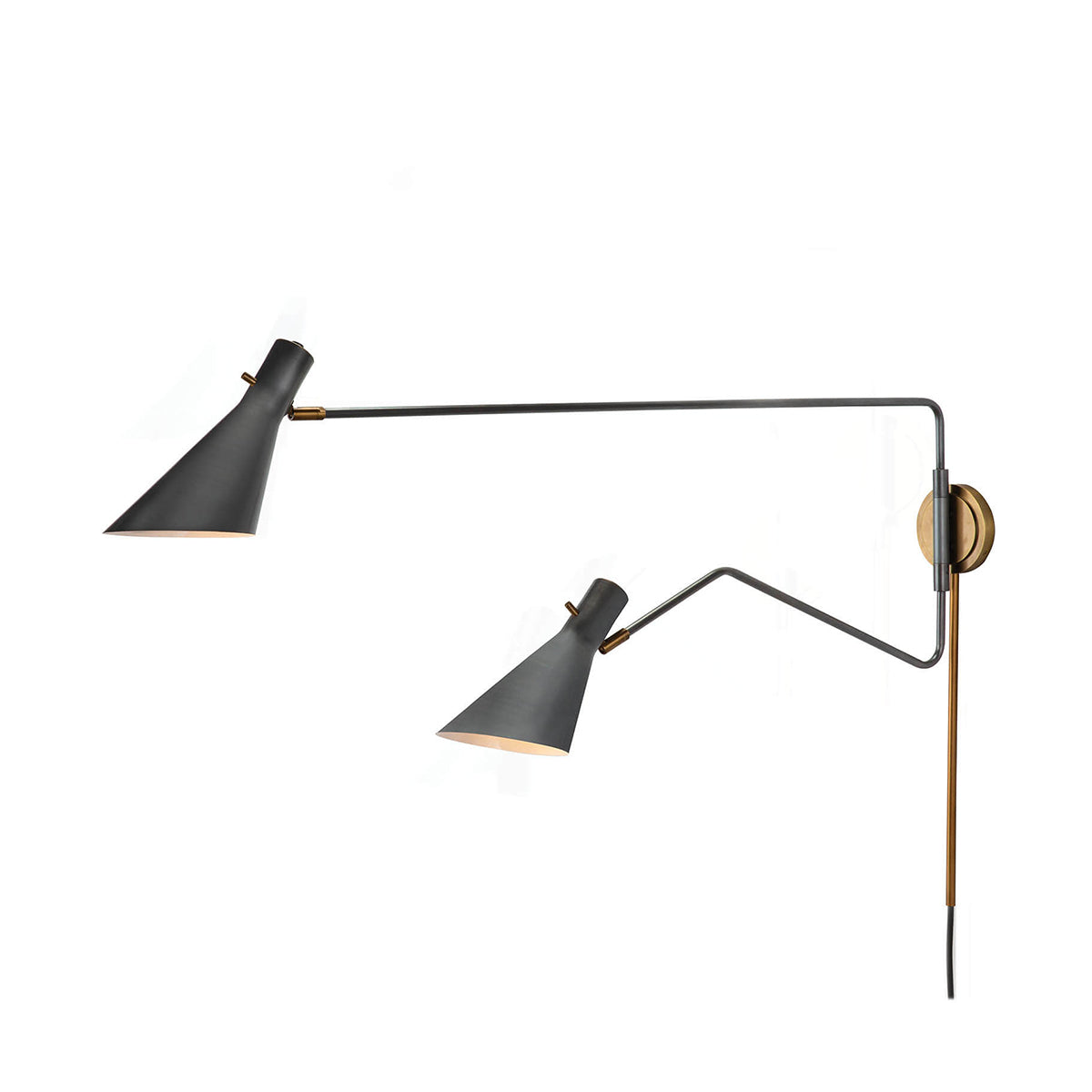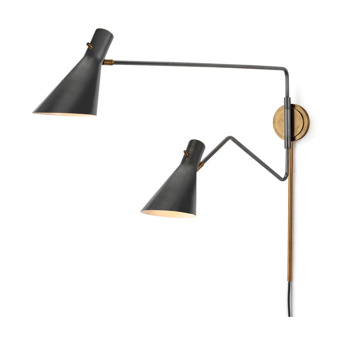Bring the luxe sculptural aesthetic with the Spyder Sconce. It parades two adjustable arms in a Blackened Brass and Natural Brass finish for a smooth visual impact. Two shapely shades with a Blackened Brass offer directional or task lighting on demand. Place it in your bedroom, living room, or home office to enjoy gentle illumination and fine visuals.