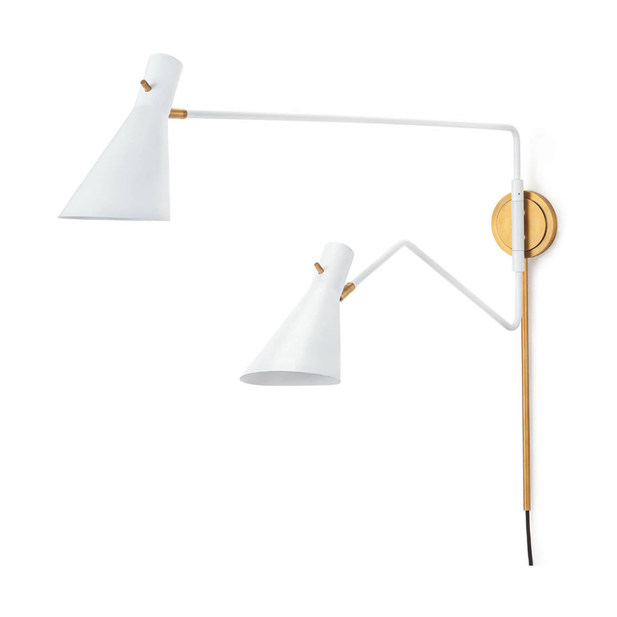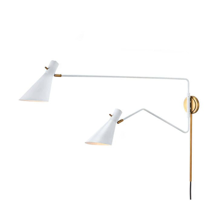 Bring the luxe sculptural aesthetic with the Spyder Sconce. It parades two adjustable arms in a White and Natural Brass finish for a smooth visual impact. Two shapely shades with a White finish offer directional or task lighting on demand. Place it in your bedroom, living room, or home office to enjoy gentle illumination and fine visuals.