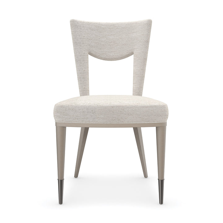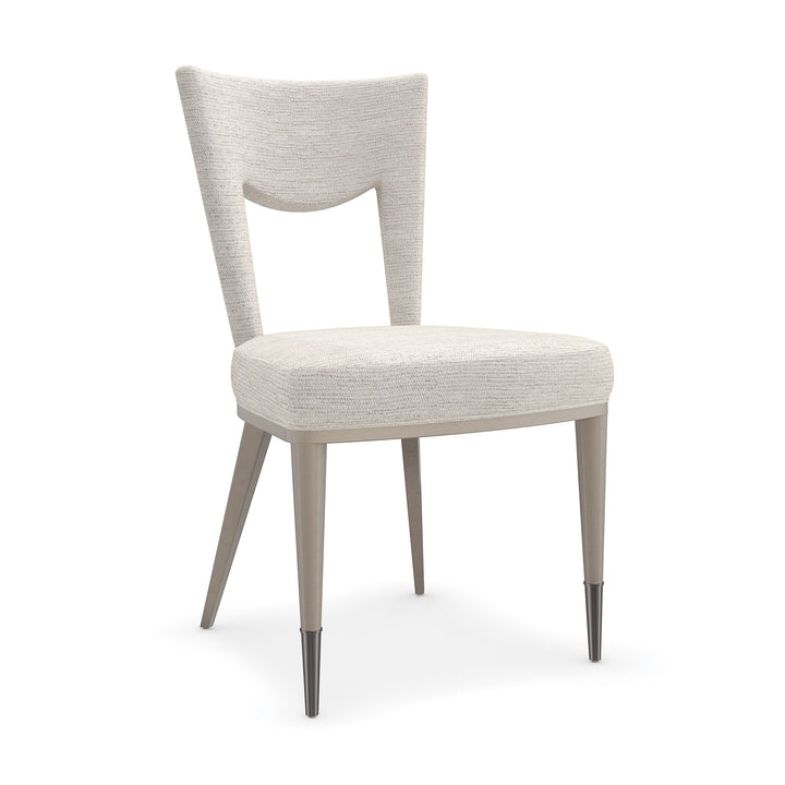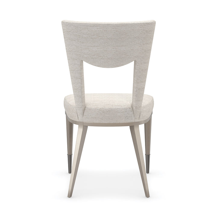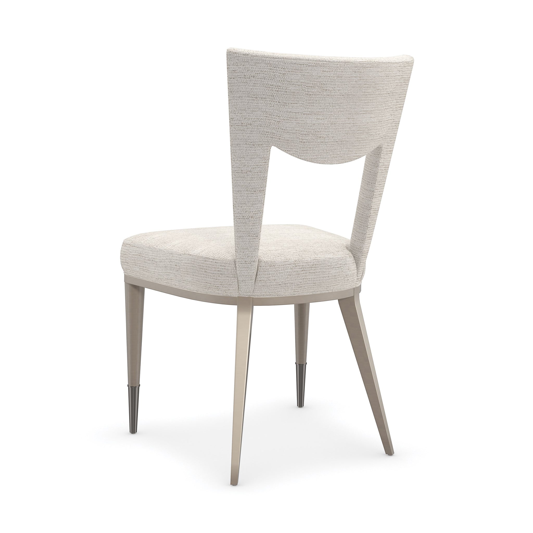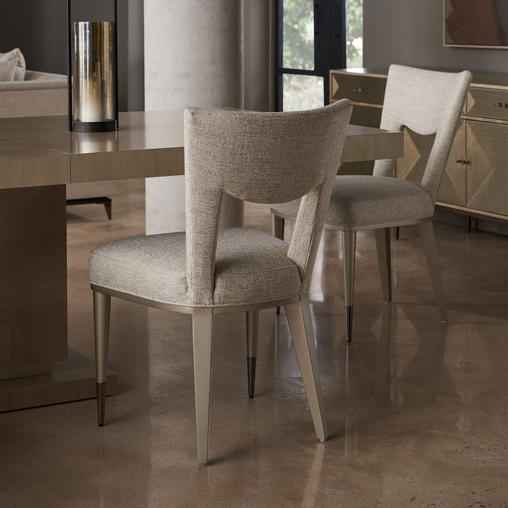 Experience elegance in every detail with this delicately scaled upholstered chair. Its open back features a subtle curve, making it a perfect statement piece for your dining table, vanity, or desk. Finely tailored in an inviting Woven fabric, it offers tactile appeal and a hint of shimmer with its Sparkling Argent finish. The conical front legs, capped in Deep Bronze metal ferrules, provide added contrast and a distinctive touch. Elevate your space with this chair that effortlessly combines sophistication and comfort.