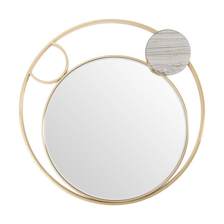This luxurious mirror seamlessly blends modern and contemporary aesthetics. Crafted with two layers of Stainless Steel rings in a Polished Brass finish, it features a subtle Light Marble accent with Grey veins. The clear circular mirror and sleek design make this piece a bold statement for any room.