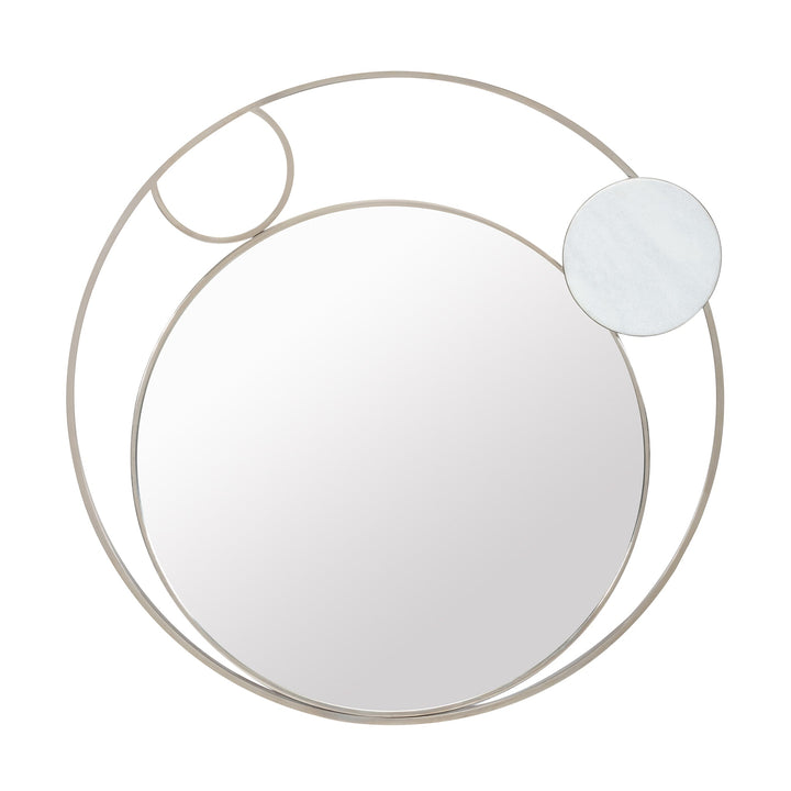 This luxurious mirror seamlessly blends modern and contemporary aesthetics. Crafted with two layers of Stainless Steel rings in a Polished Nickel finish, it features a subtle Light Marble accent with Grey veins. The clear circular mirror and sleek design make this piece a bold statement for any room.