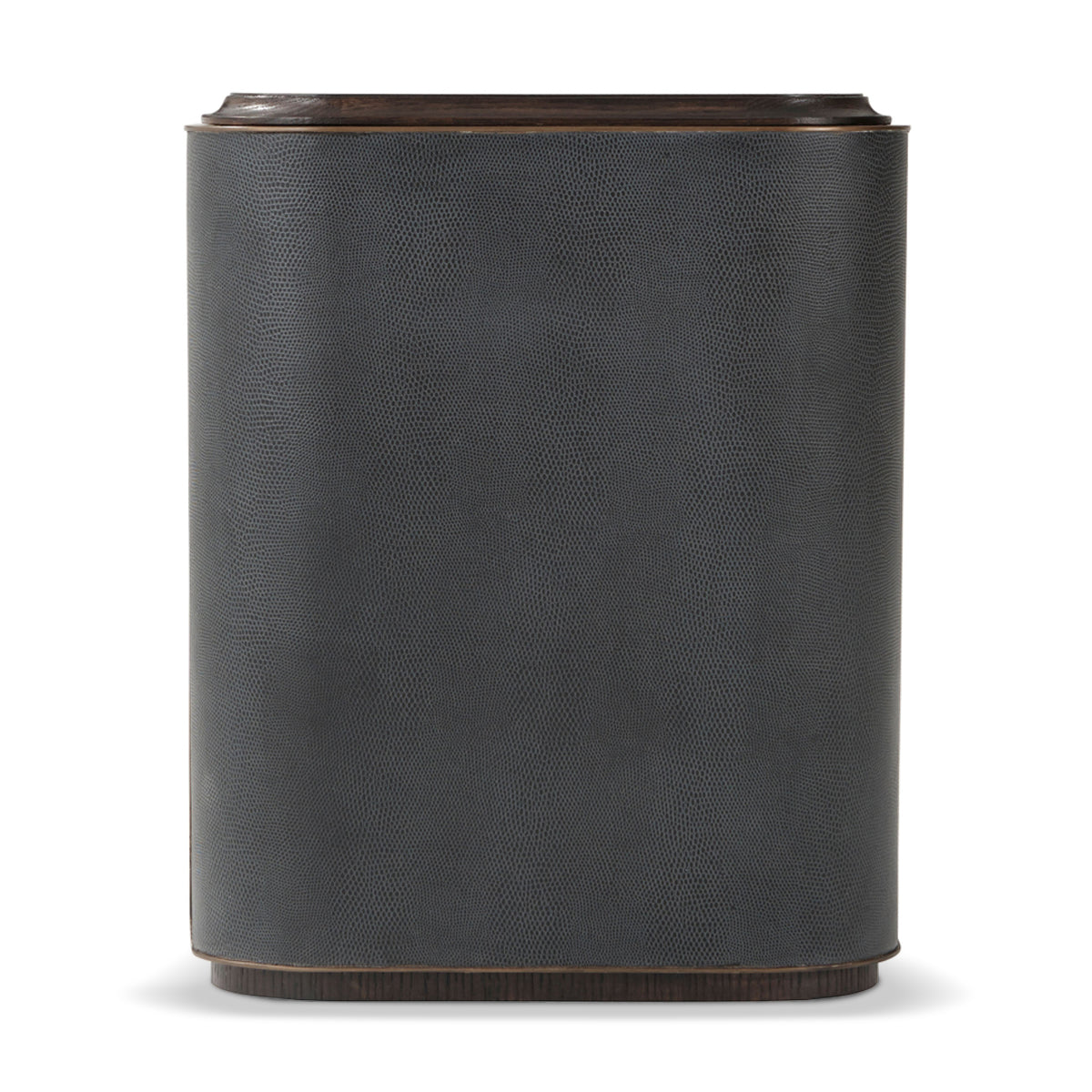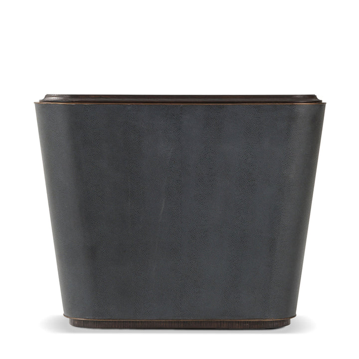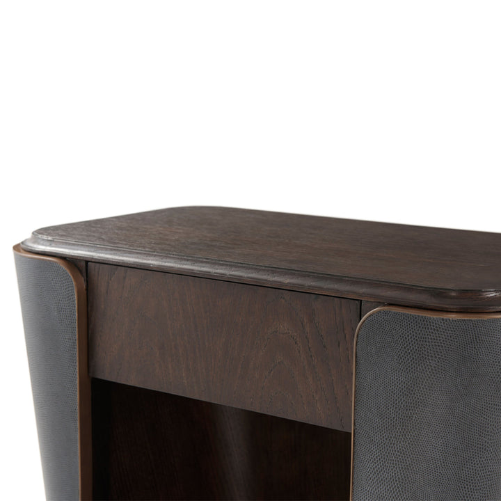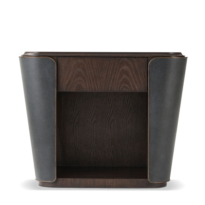 Repurposing traditional wooden charm into a contemporary silhouette, the Amour Nightstand II is a practical, durable, and stylish piece to grace your bed's side. The intriguing features include a Cigar Club finish, a reptile-embossed leather-wrapped sheath, and a frieze drawer followed by an open section.