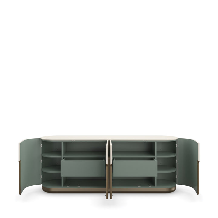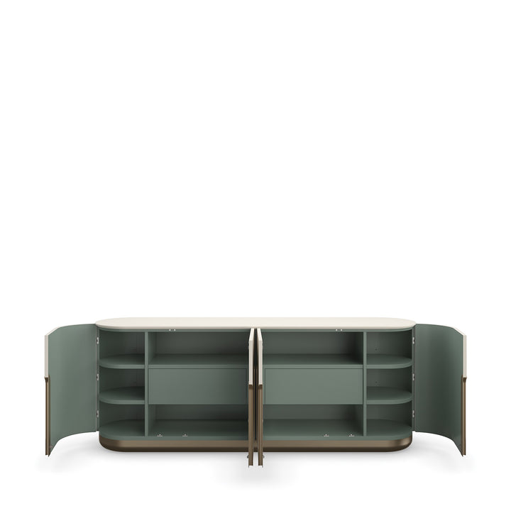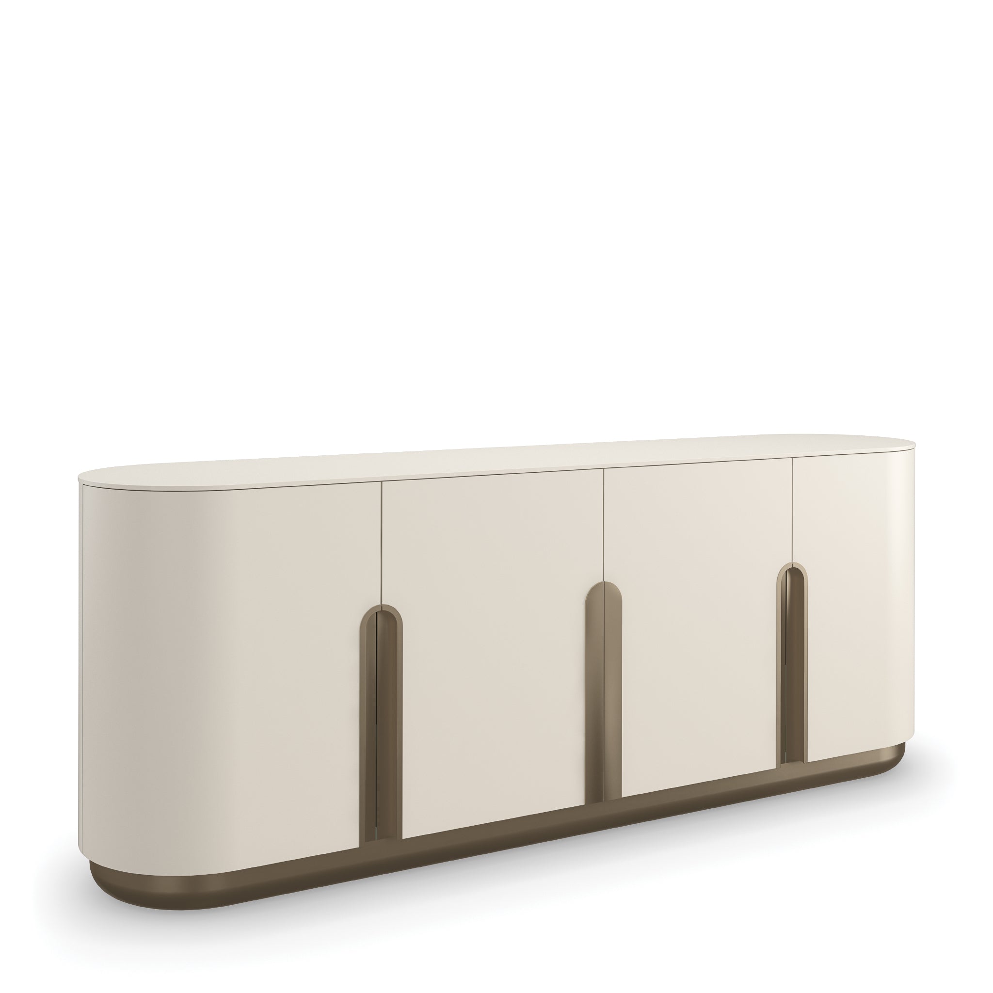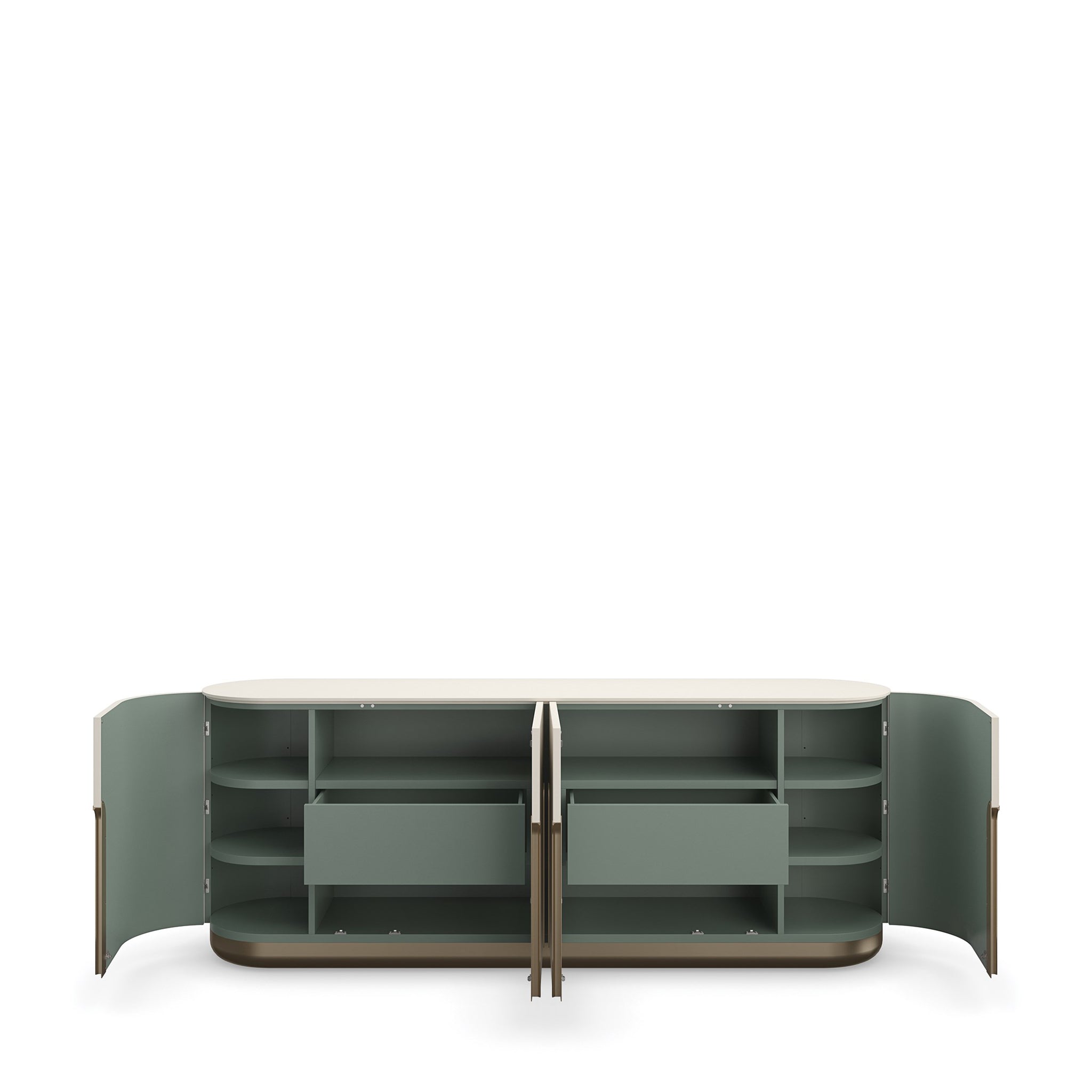 Embrace the essence of Moroccan coastal architecture with our stunning oval vase. Featuring a series of arches formed by Lucent Bronze hardware, this tactile design evokes the charm of whitewashed structures. Clad in a crisp Burnished Adobe finish and balanced on a metallic plinth base, its clean lines and gently rounded edges bring versatile style to dining interiors. Inside, a chic Basil finish complements two center drawers and open storage with adjustable shelves, offering both function and organization.