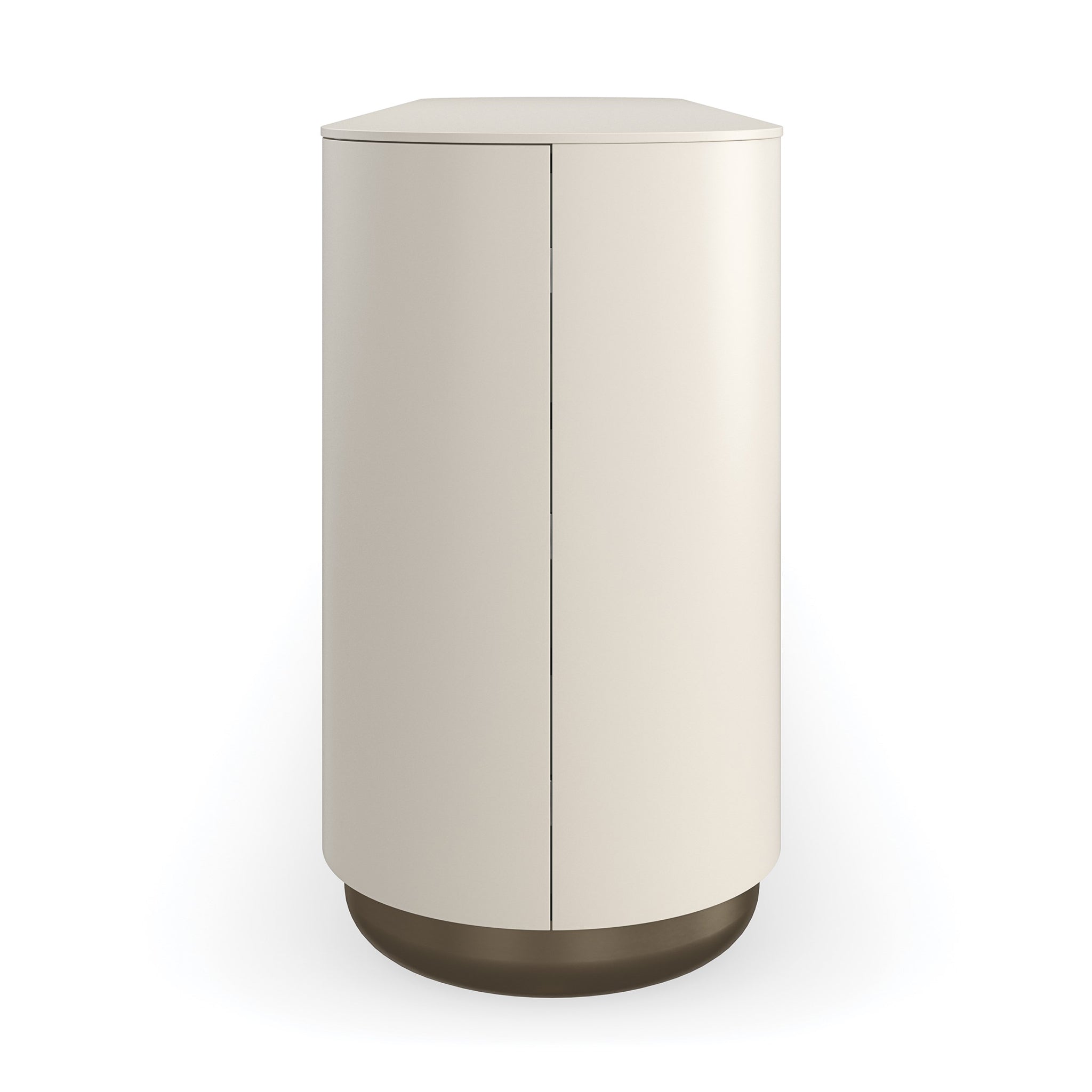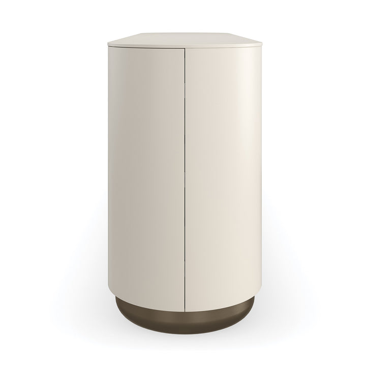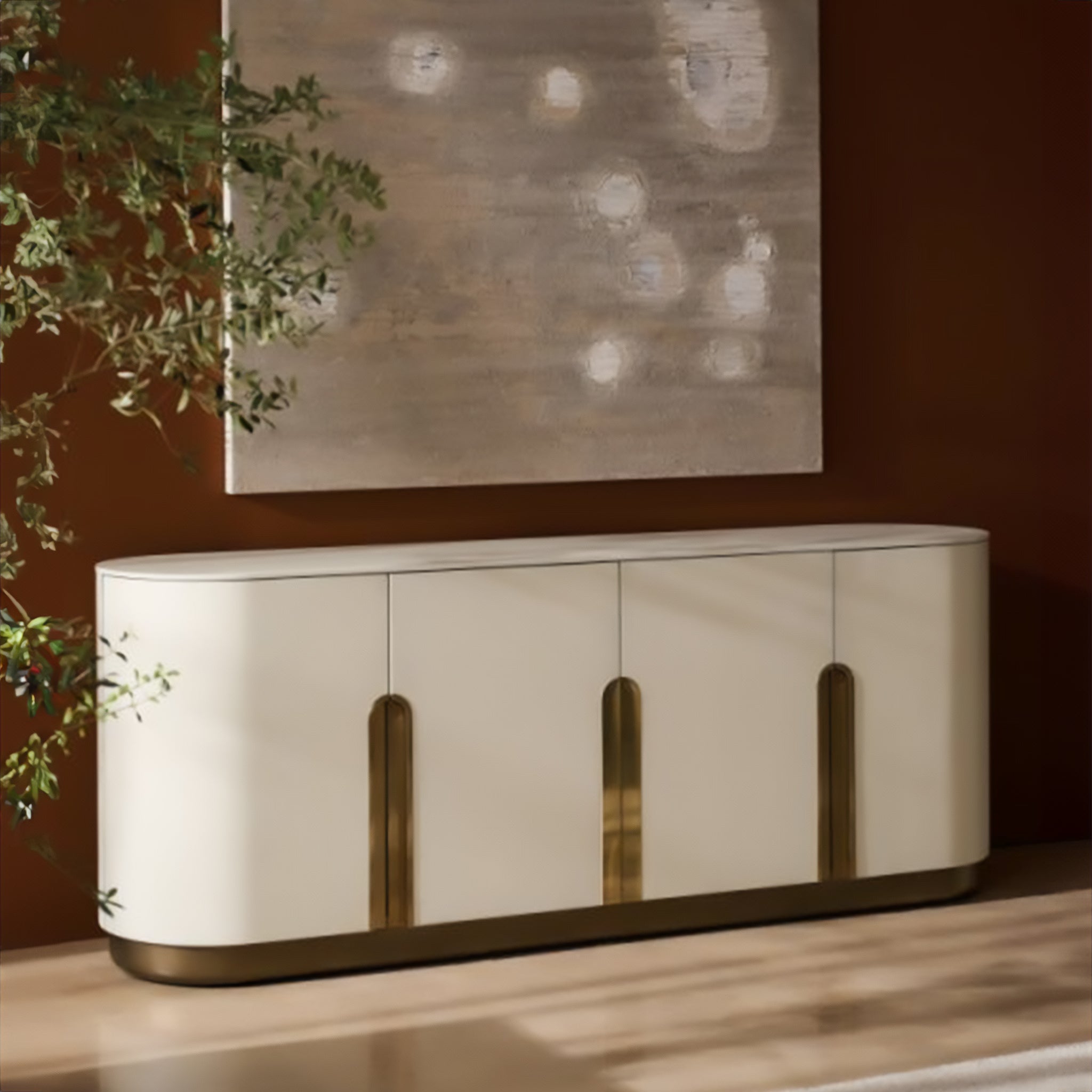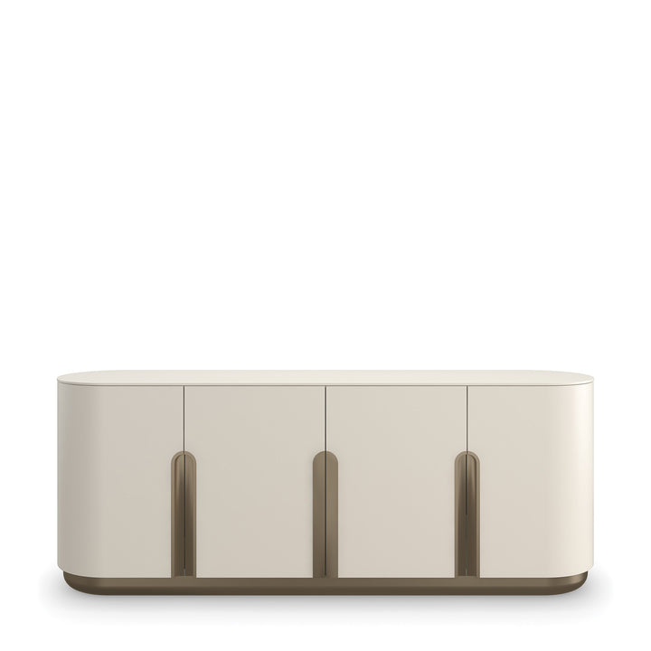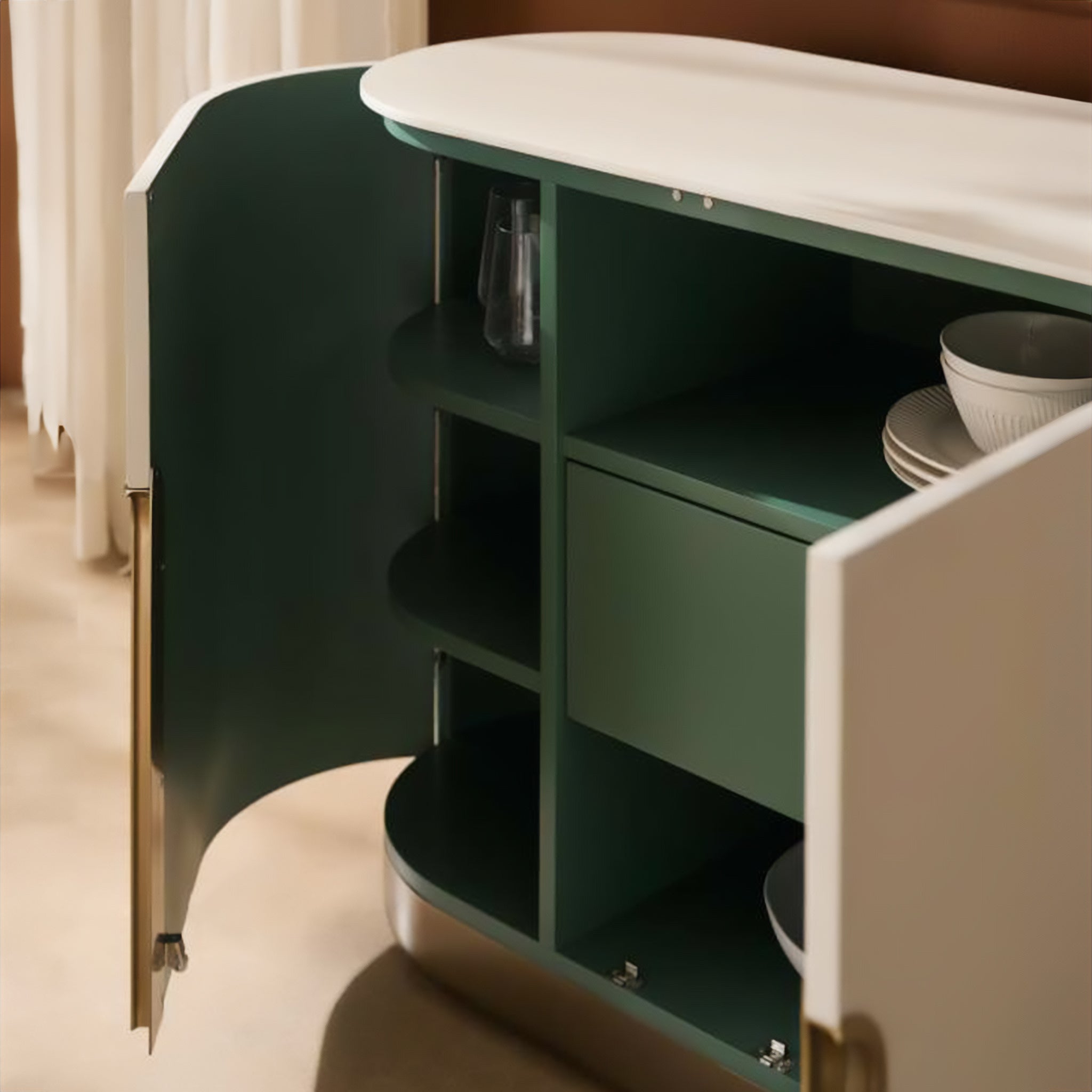 Embrace the essence of Moroccan coastal architecture with our stunning oval vase. Featuring a series of arches formed by Lucent Bronze hardware, this tactile design evokes the charm of whitewashed structures. Clad in a crisp Burnished Adobe finish and balanced on a metallic plinth base, its clean lines and gently rounded edges bring versatile style to dining interiors. Inside, a chic Basil finish complements two center drawers and open storage with adjustable shelves, offering both function and organization.