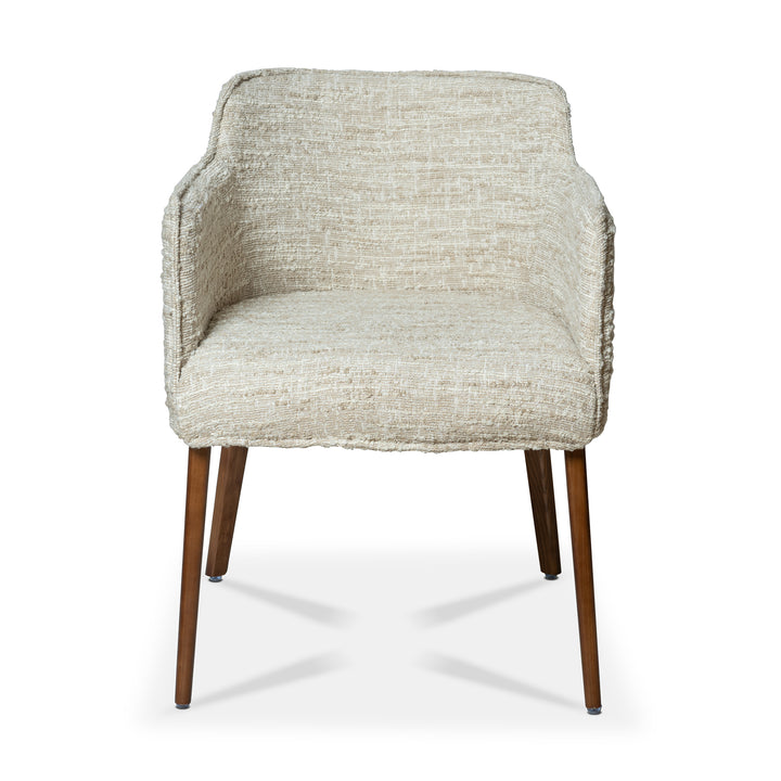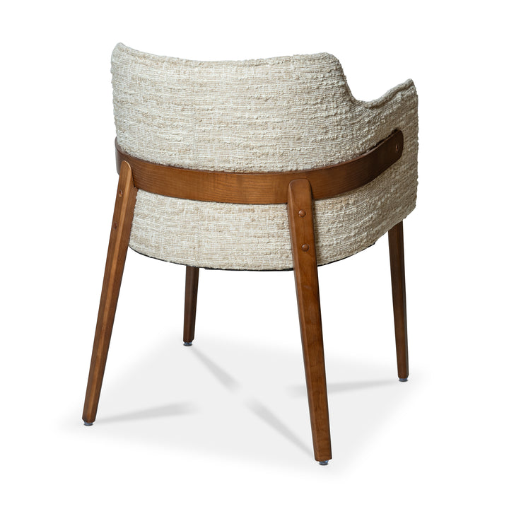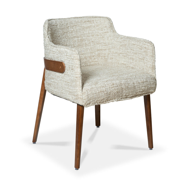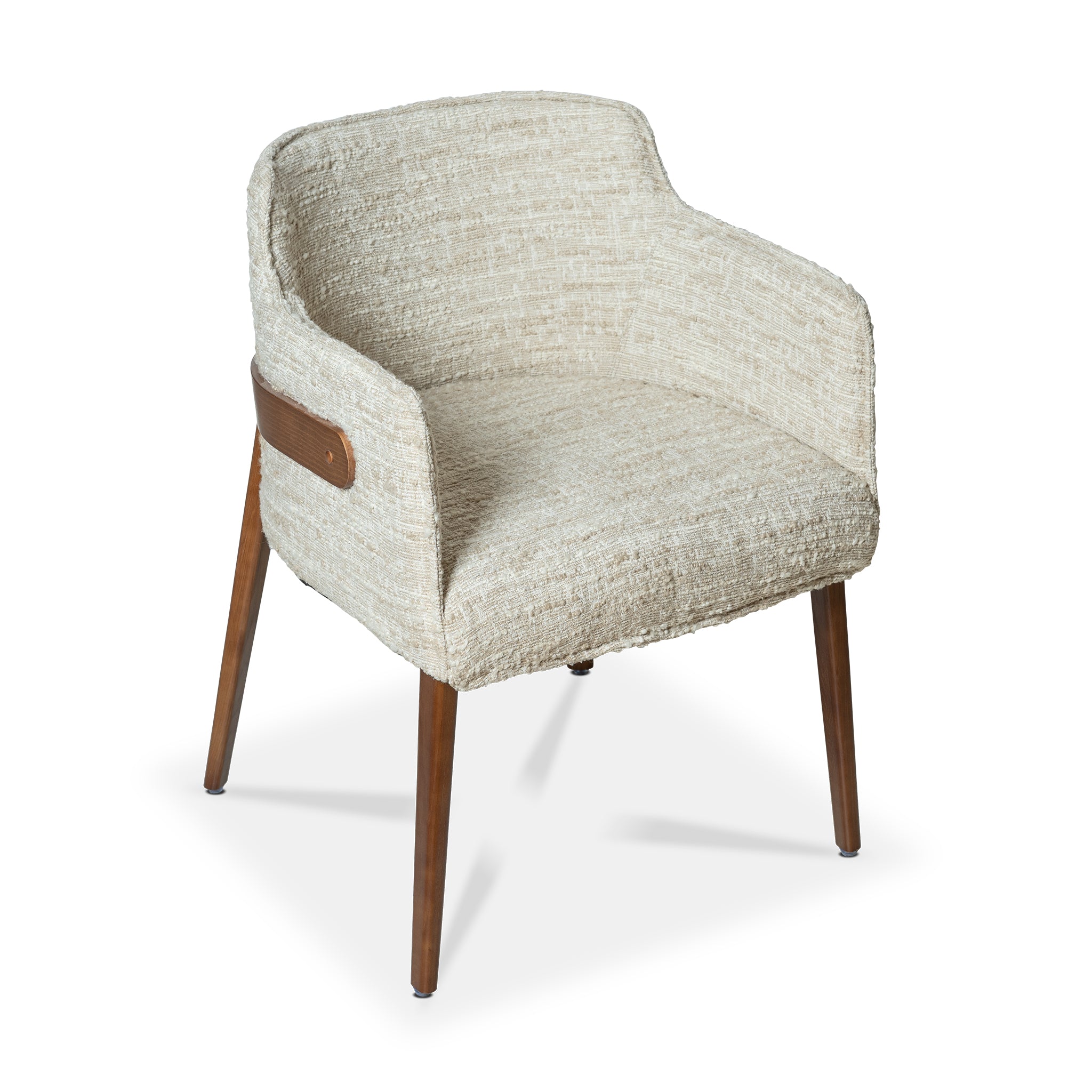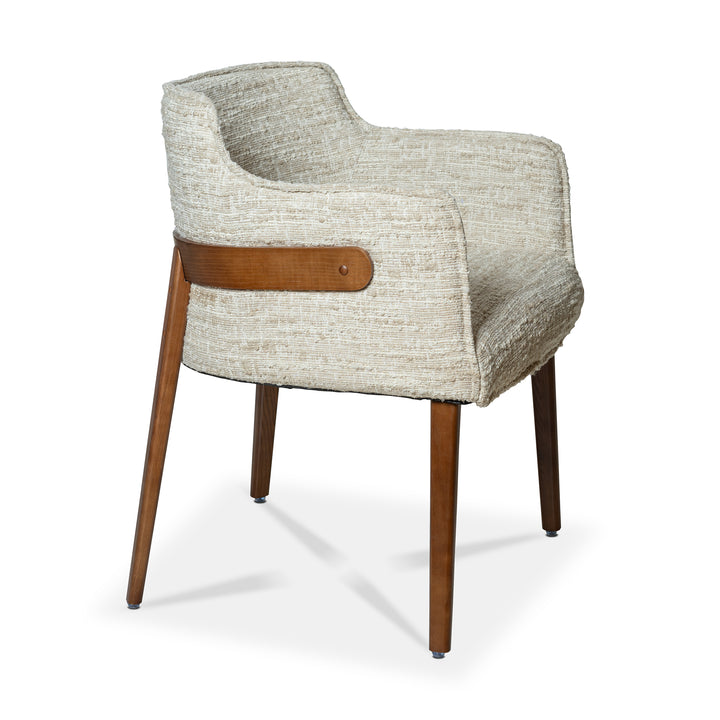 Upholstered in angora fabric, the chair provides a comfortable dining experience. The walnut veneer finished back and legs give it a simple yet elegant presence.