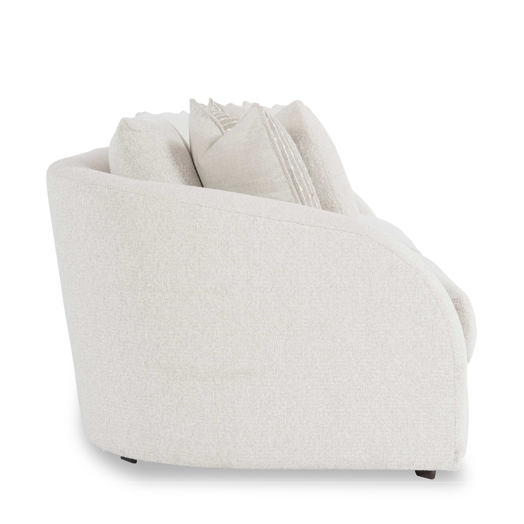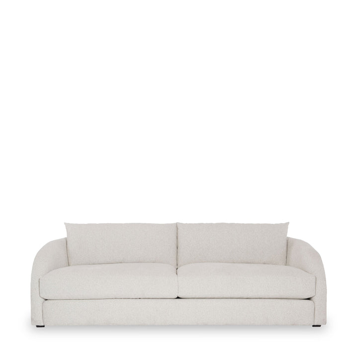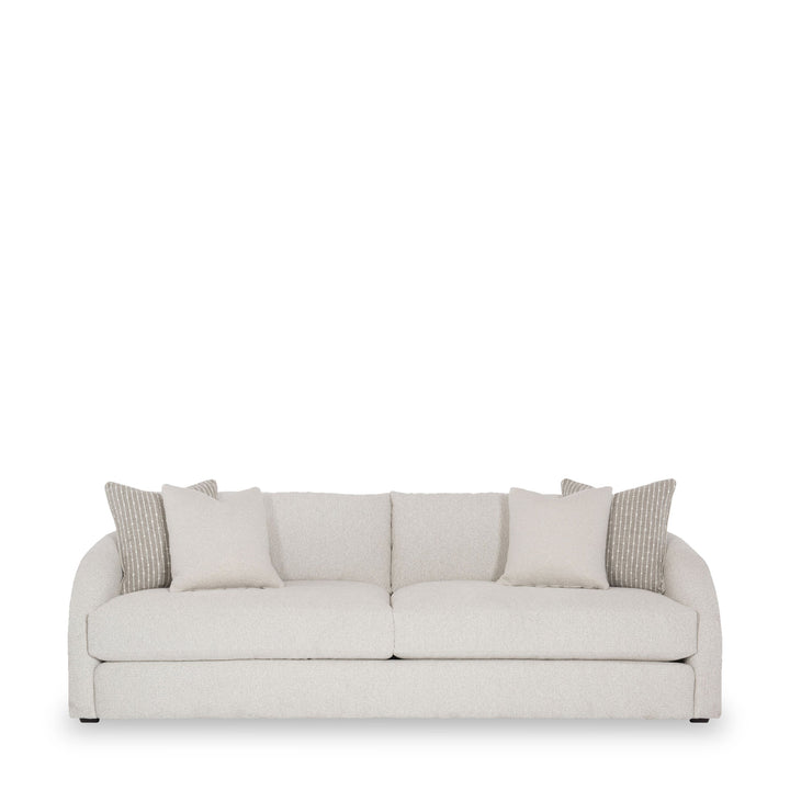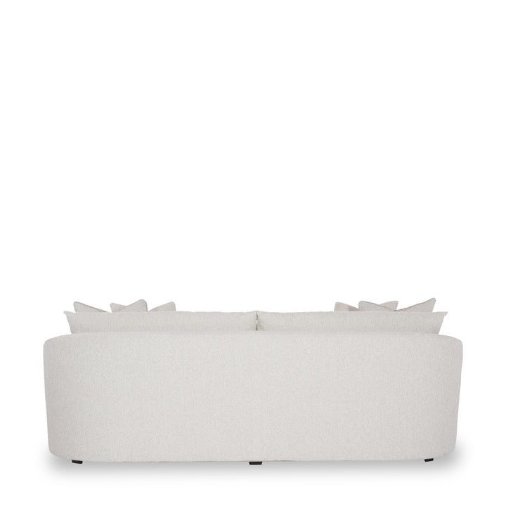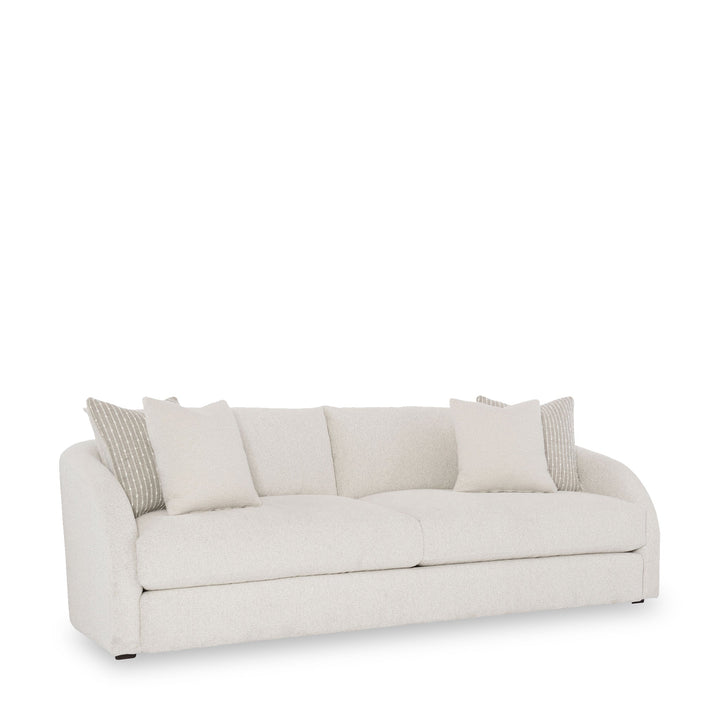 Create a compelling impact with minimal aesthetics. This plush sofa creates a cozy setting in the room thanks to its soft upholstery in a muted tone. The loose seat and back cushions ensure comfort, while the additional pillows elevate the overall appearance.