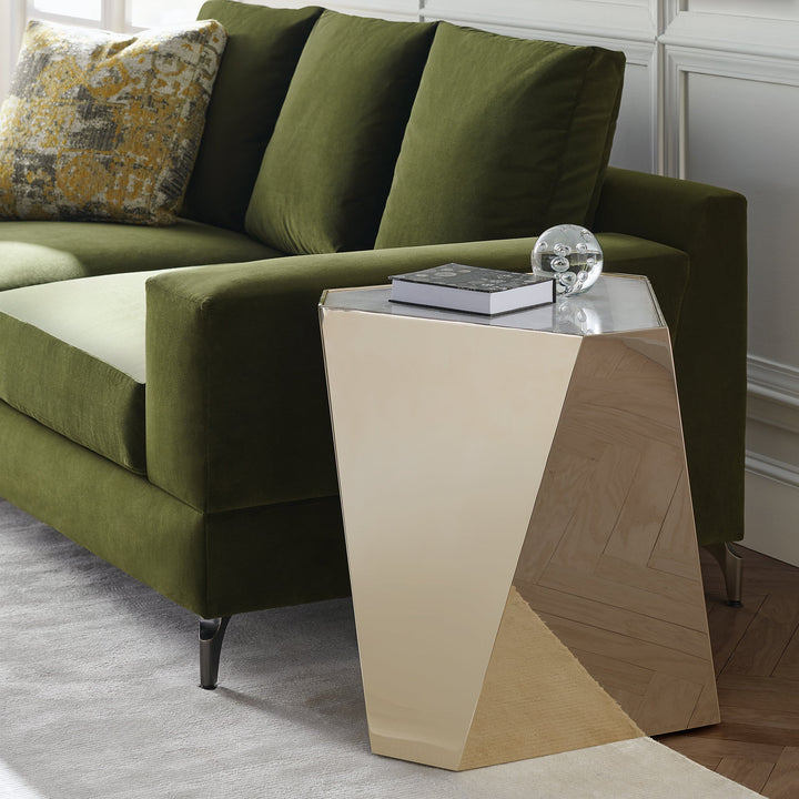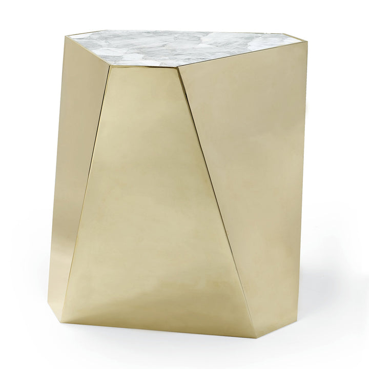 Featuring a unique design, this hexagonal side table will stir a conversation in any room. It boasts irregular angles in a Majestic Gold finish to create a mesmerizing aesthetic. The piece is crowned with a White Crystal Stone top for a timeless look. Combine it with your favorite chair or sofa to make a bold statement.