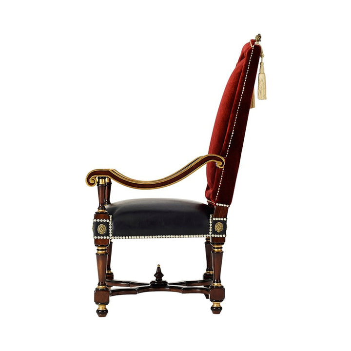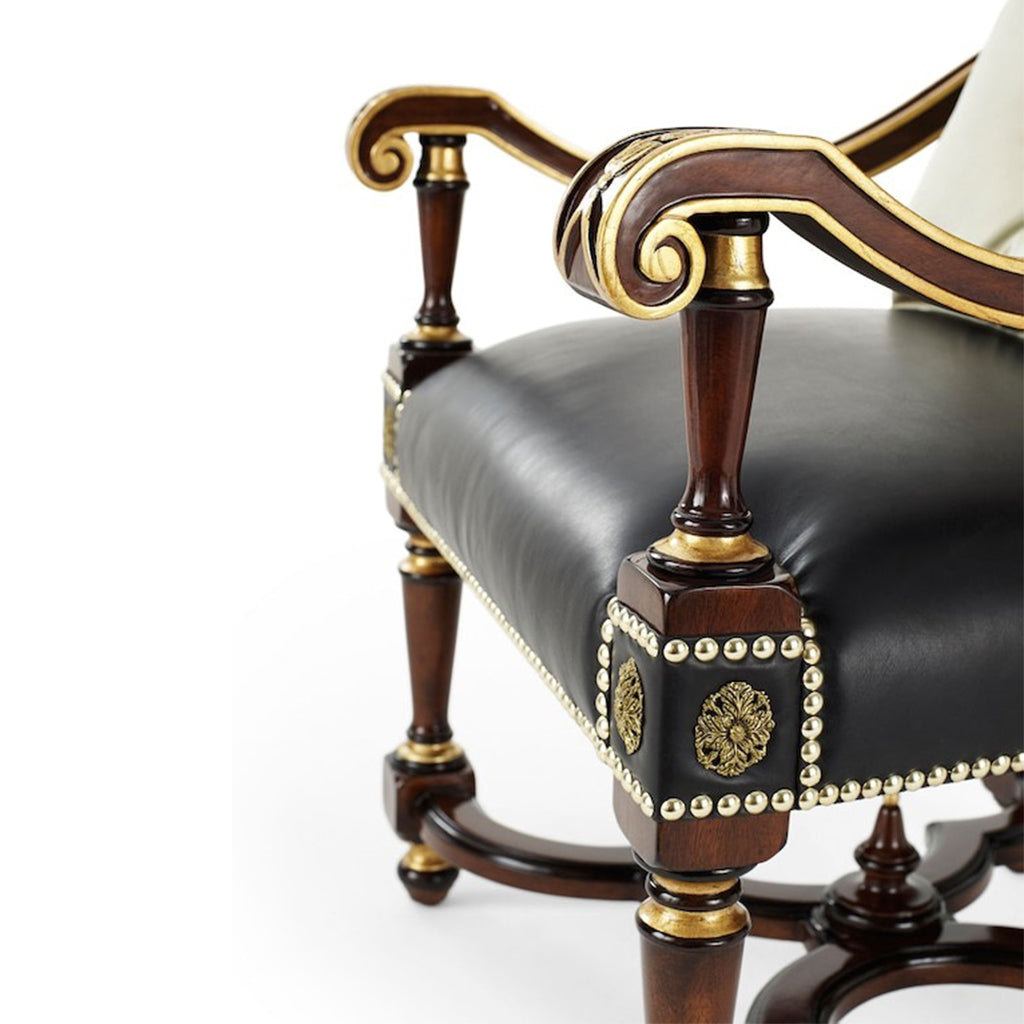 Resting on turned legs joined by a serpentine 'X' stretcher, the Parlour Chair isn't just a work of art; it's built to last for generations. It's made of Mahogany Wood and has a tall arched padded back that matches its leaf-carved open scroll arms for a timeless look. Enjoy comfortable seating on its armorial embroidery panel over an upholstered seat.