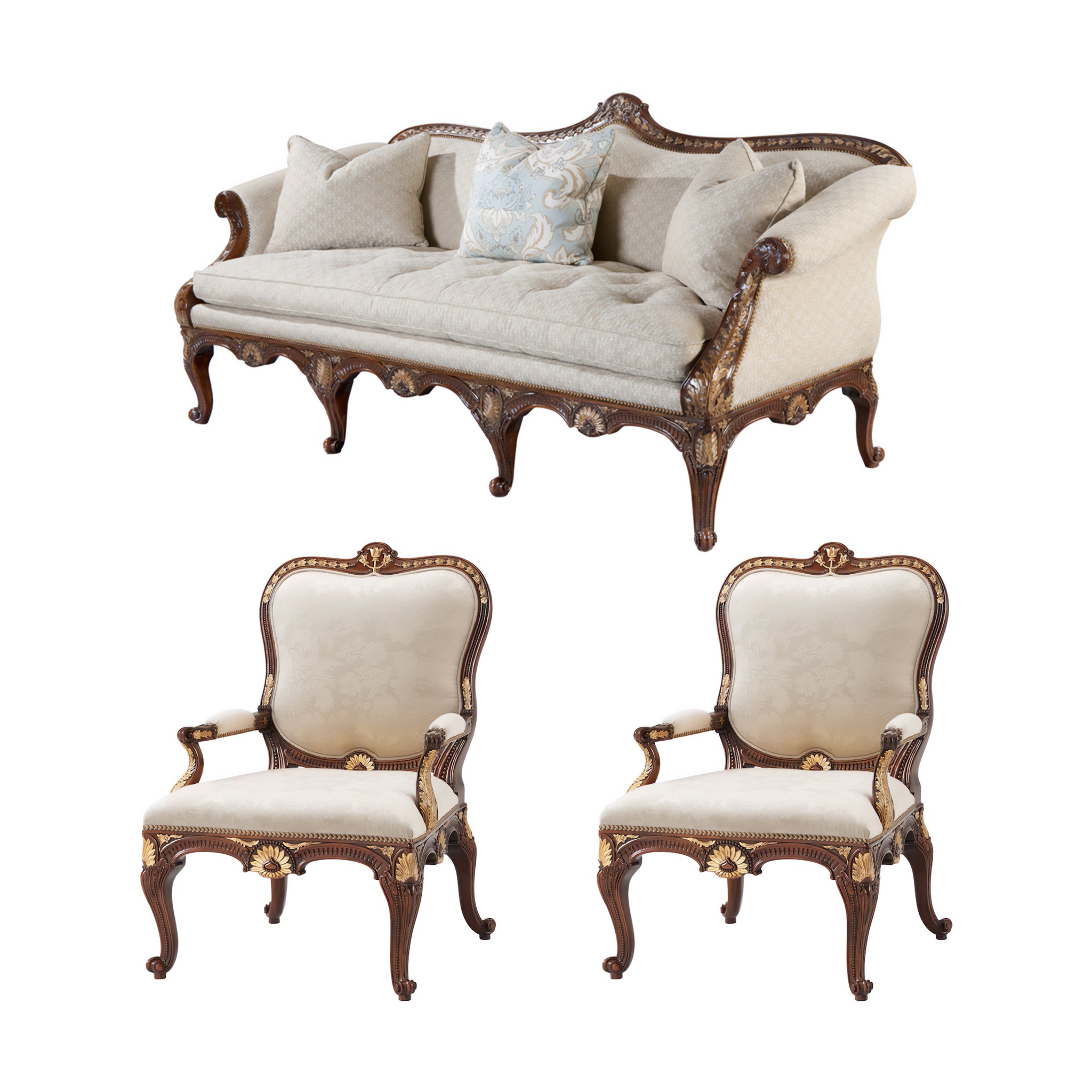 Experience luxury with the Spencer House Living Set, which combines elegance and skillful craftsmanship. This set features a traditional serpentine design and is embellished with detailed carvings of flowers and leaves. The fully upholstered sofa is framed by padded scrolled arms and delicate tufting and sits above eight carved cabriole legs, creating a masterpiece of design and comfort. Accompanied by a pair of chairs, this classic set turns any area into an elegant retreat.