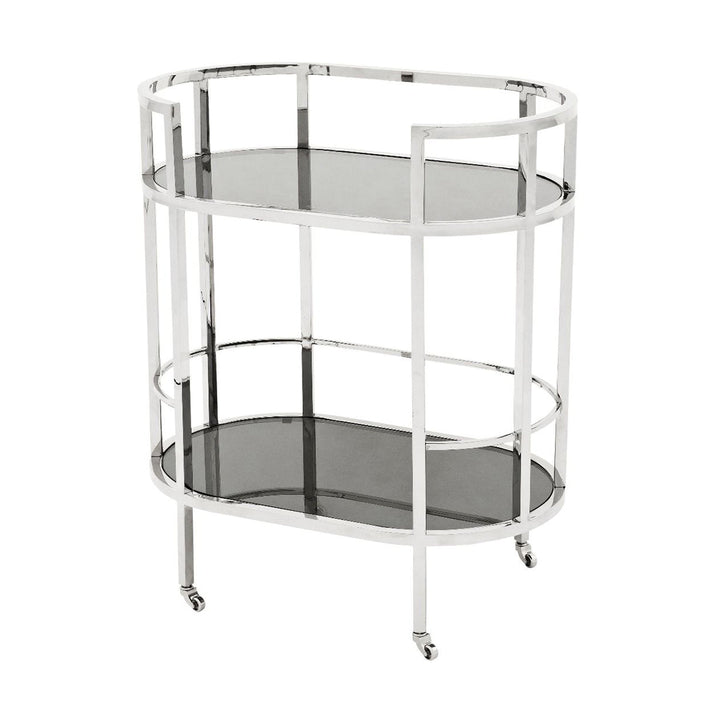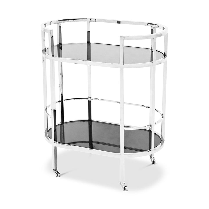 Serve cocktails and other drinks in style with the Townhouse Trolley. This fabulous bar cart has an elegant curved polished stainless steel frame that holds two levels of dark smoked glass. Perfect for pouring and storing.