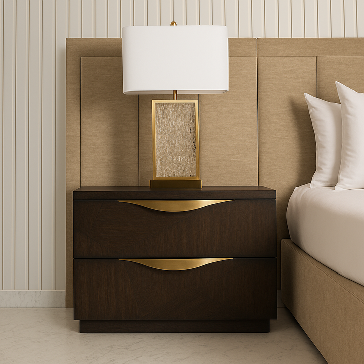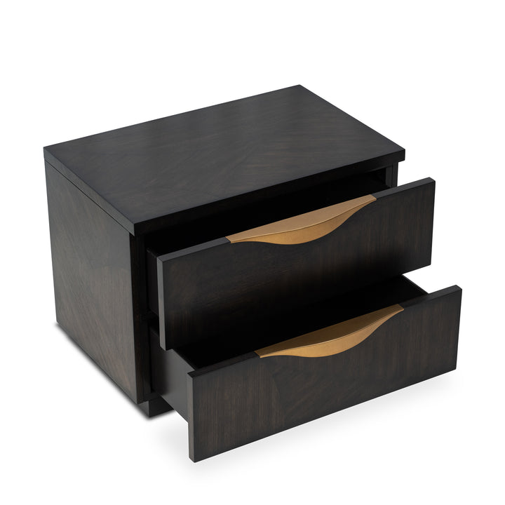 Defined by a dark walnut veneer with striking art nouveau marquetry, this nightstand blends bold character with refined detail. Two drawers provide ample storage, and its compact form makes it a statement piece beside the bed. Pair it with the vallery chest to complete the collection.