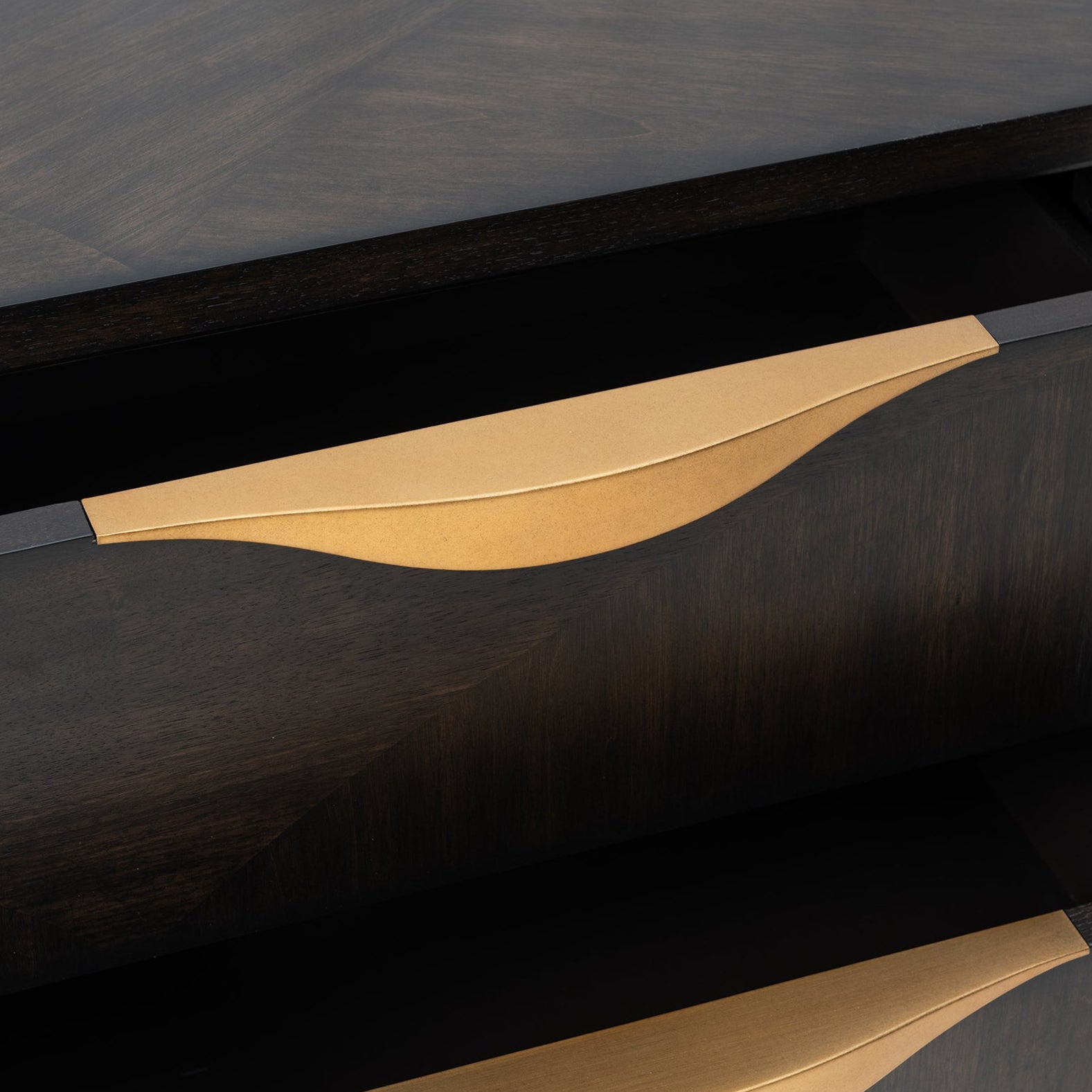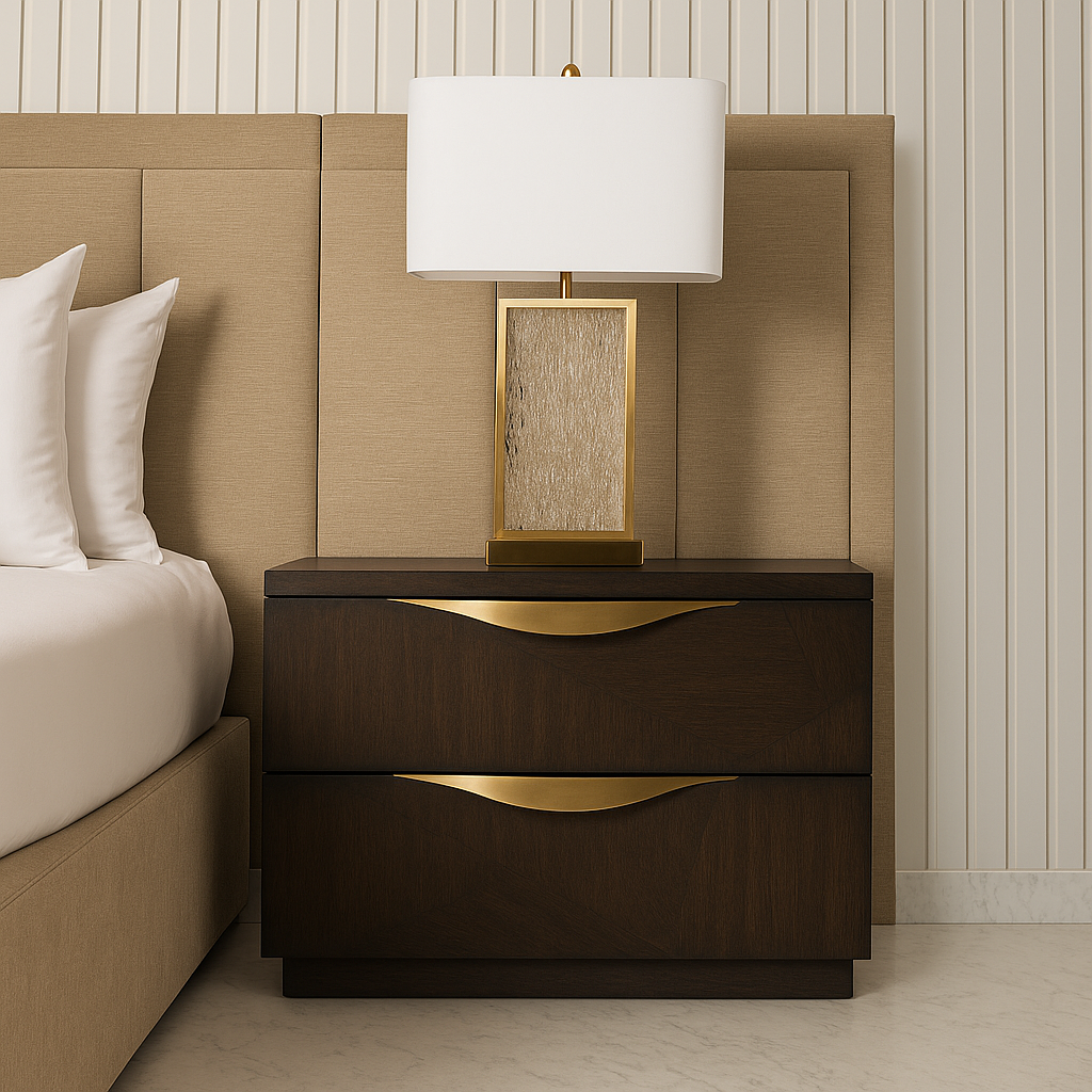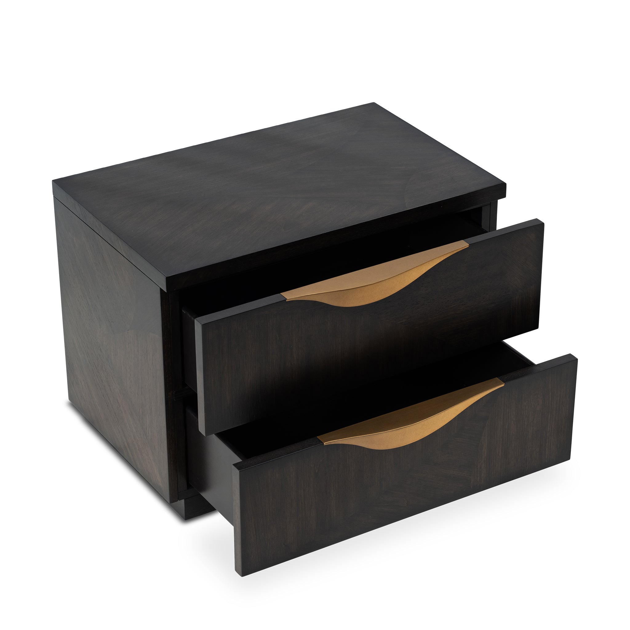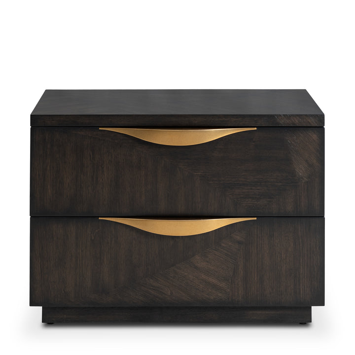 Crafted in dark walnut veneer with art nouveau marquetry, this nightstand offers a balance of function and style. Antique brass pulls bring a touch of contrast against the rich wood finish. Designed to mirror the vallery left element, it completes the look with symmetry and sophistication.