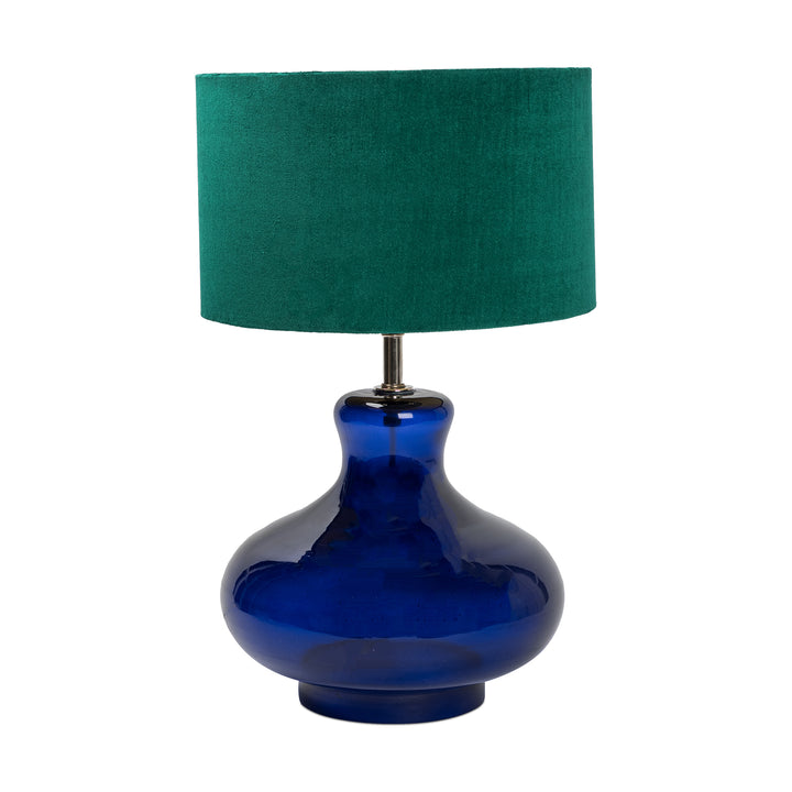 Experience the epitome of style and functionality with this exquisite lighting masterpiece. Immerse yourself in the allure of a drum-shaped shade swathed in luxurious Velvet fabric, adorned with tasteful fringes that enhance the mesmerizing flow of light. The graceful Blue Glass base adds a touch of elegance, perfectly harmonizing with its chic aesthetic.