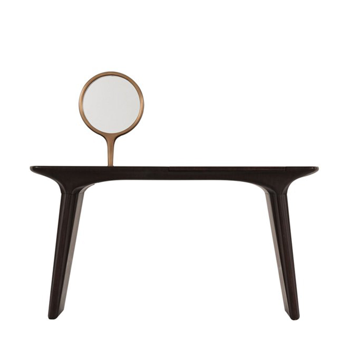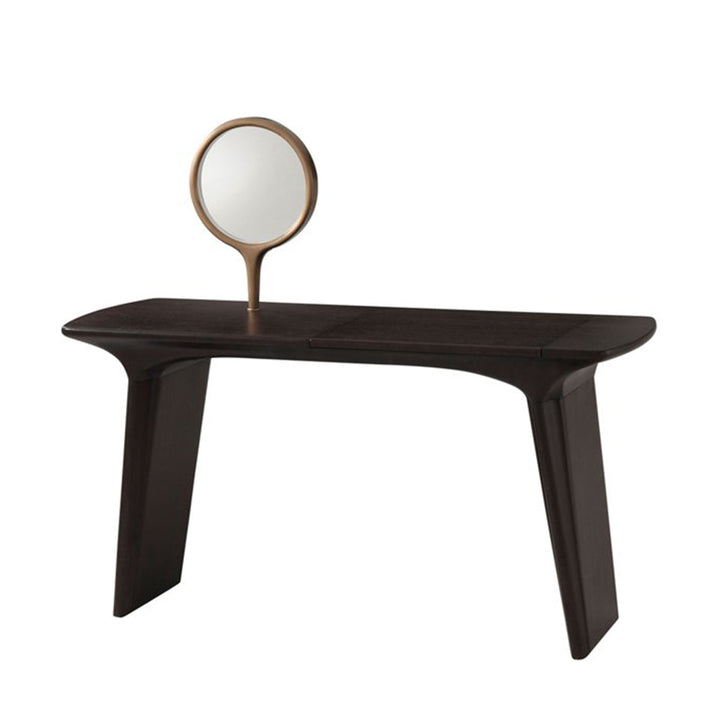 Concrete featured dressing cum writing table to foster your modern etiquette living. The rectangular Mahogany veneered top with a golden paneled LED amplified focus mirror is a priority maneuver. An invisible 'hinged top' merges evenly on the compact top with a felt cloth inlay for your beauty essentials. Splayed tapered pattern legs fall with genuine support.