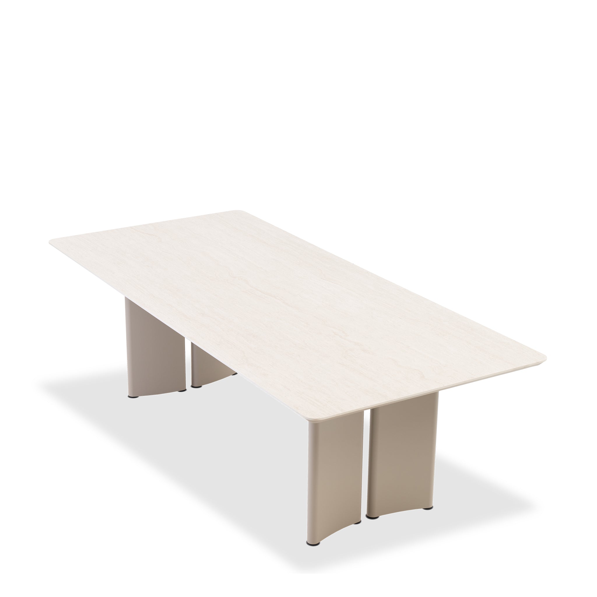 The ceramic top rests on gracefully curved aluminum legs, finished in a durable powder coat built to withstand the elements. Designed for open-air dining, its sculptural silhouette offers a quiet sophistication that anchors patios, terraces, and garden settings.