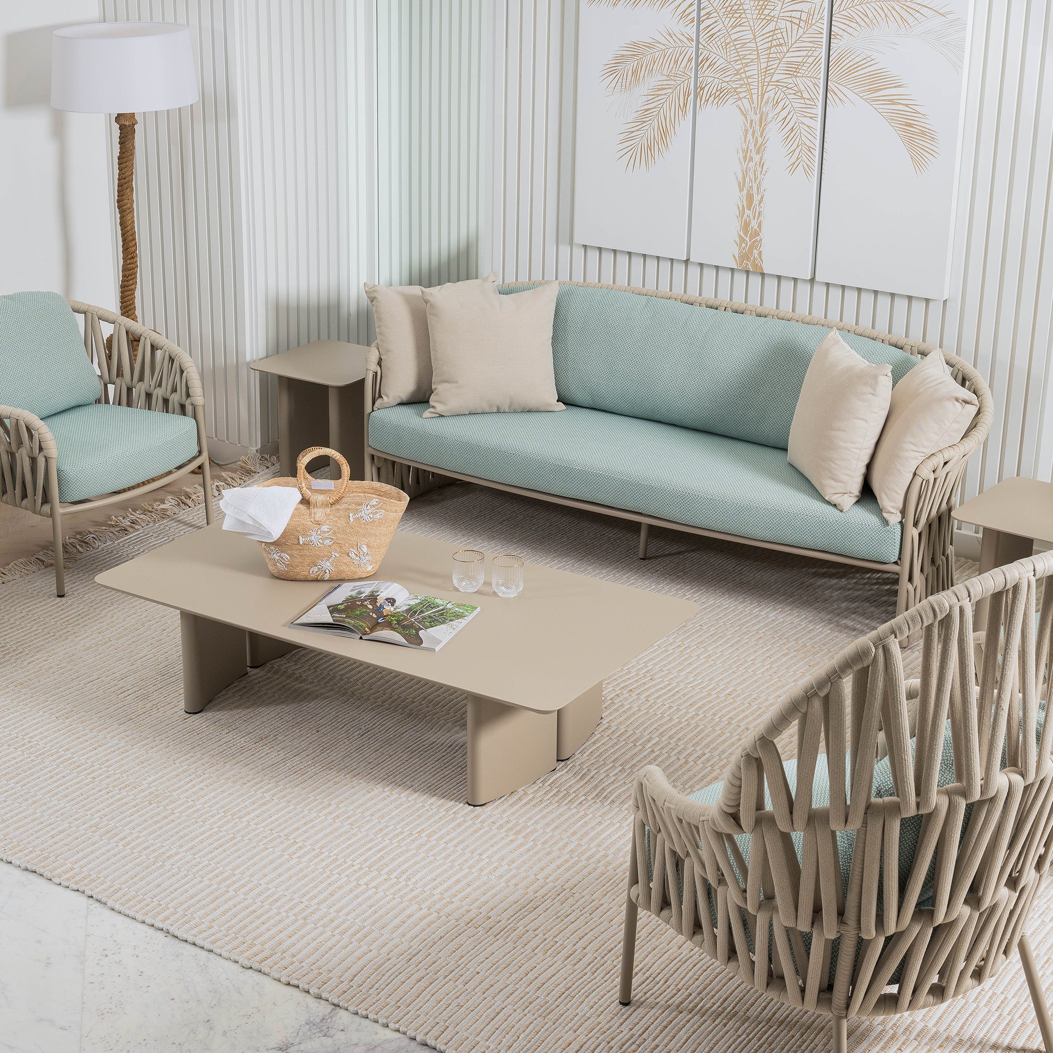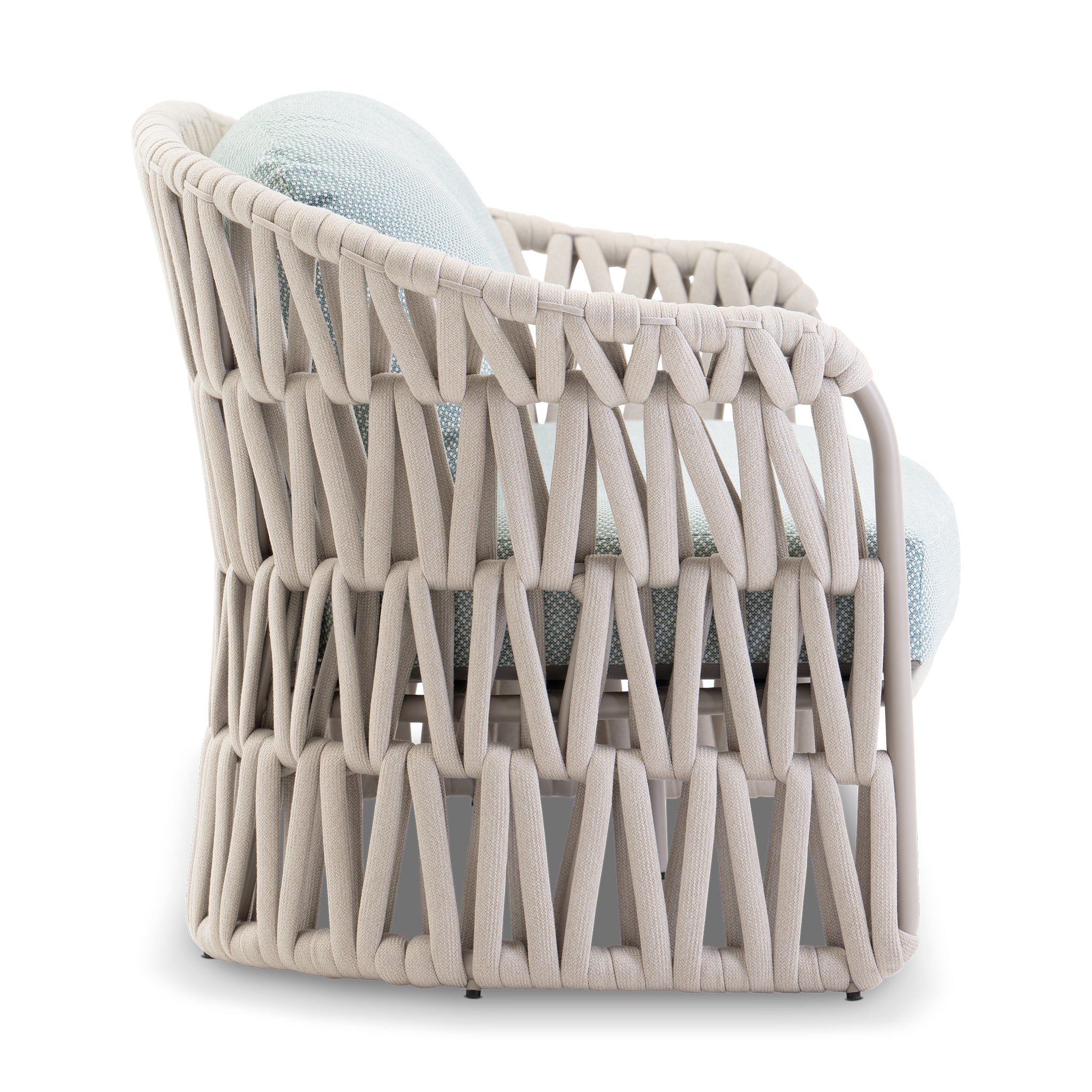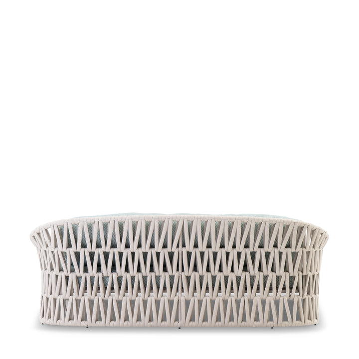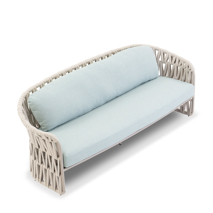 This sculptural outdoor sofa features a handwoven rope frame in a bold triangular full-weave pattern, adding depth and visual interest. Upholstered in water-resistant lattice teal fabric, the low-profile silhouette is supported by a powder-coated aluminum frame and quick-dry cushions, built to endure the elements with effortless style.