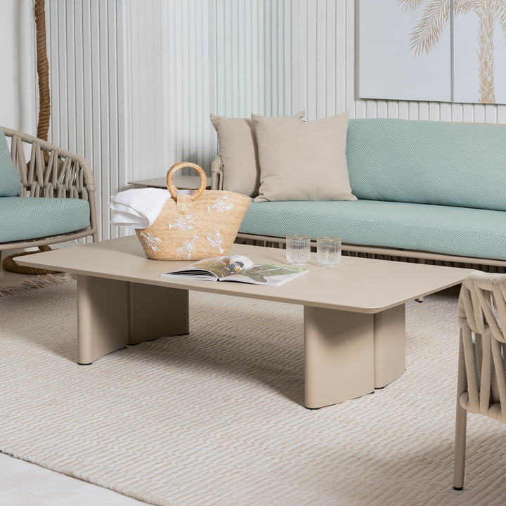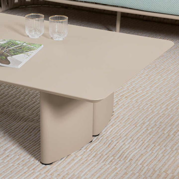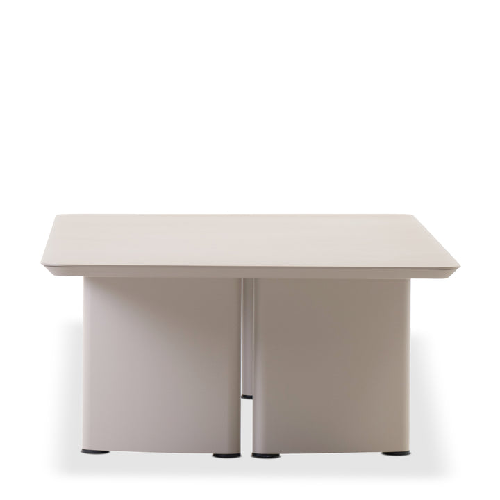 Minimalist in form, bold in structure. This outdoor coffee table is crafted from powder-coated aluminum with a low, streamlined profile. Thick, subtly curved base panels create sculptural balance. Designed to complete the victory collection.