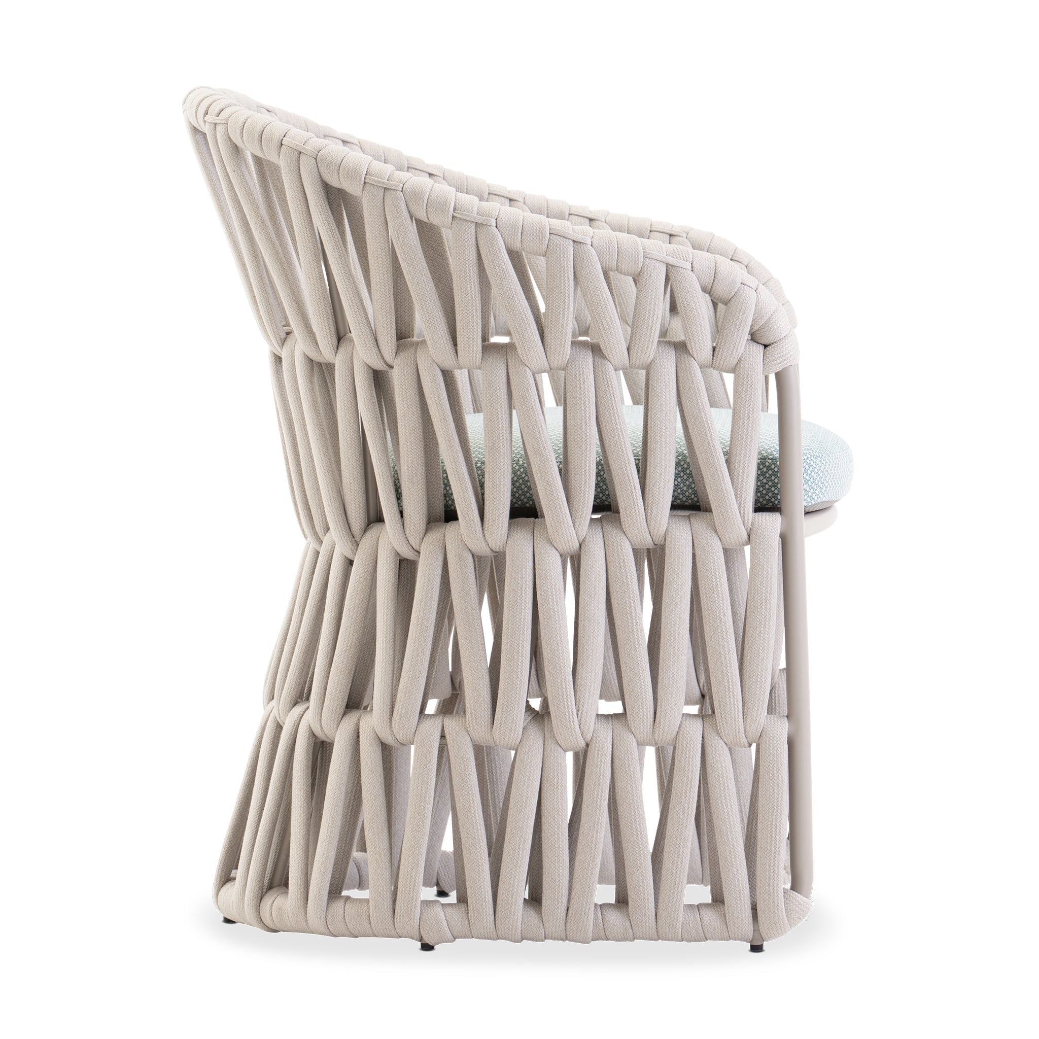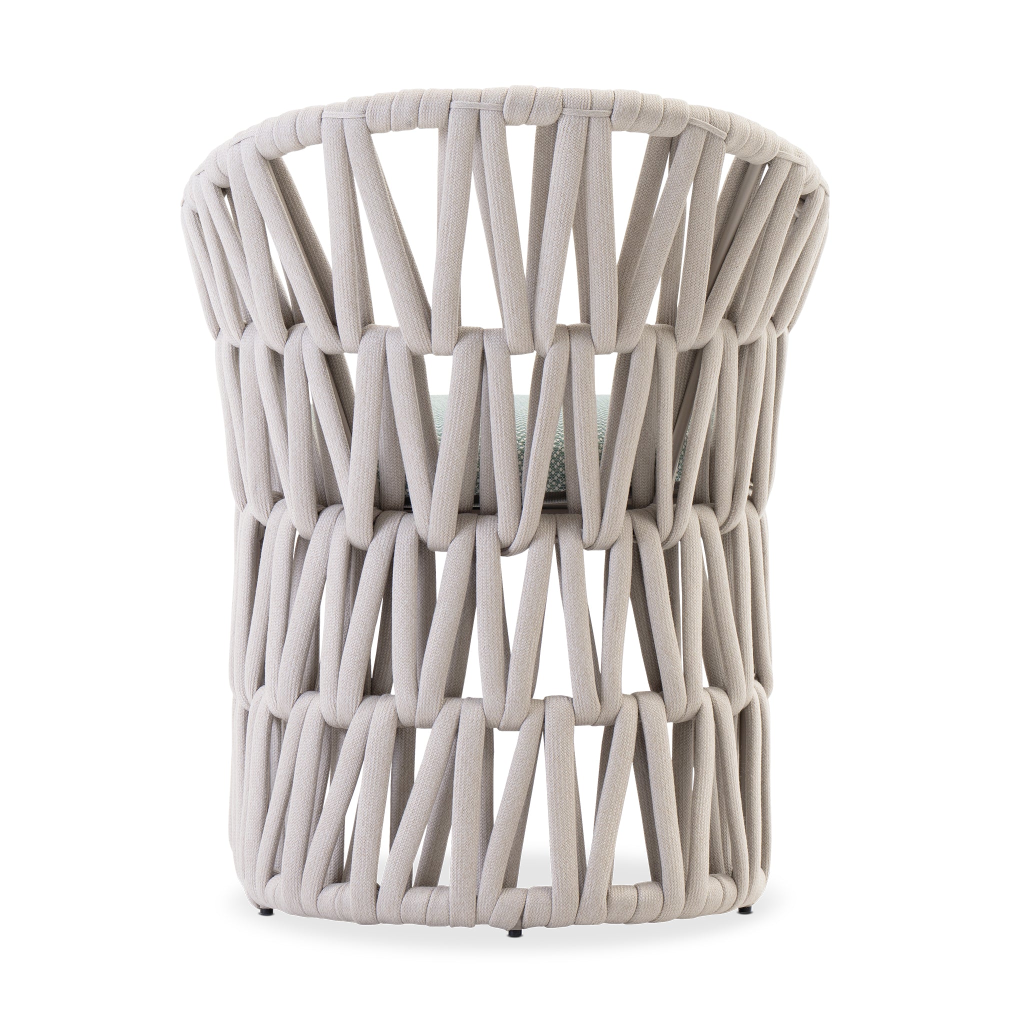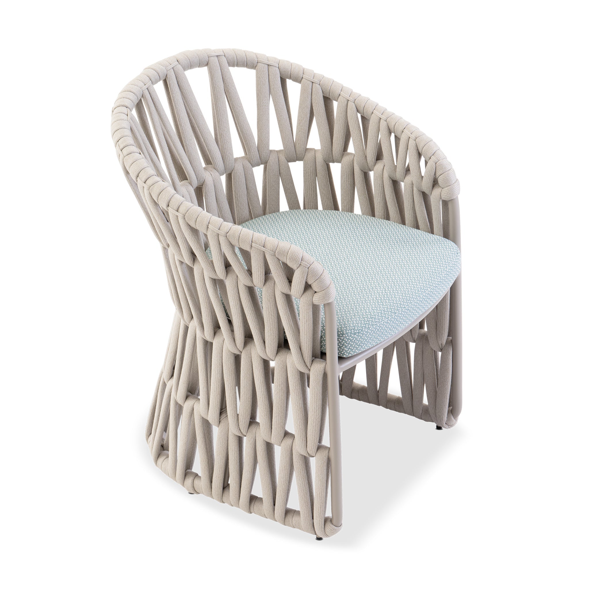 Framed in a striking full-rope weave, this dining chair merges artisanal detail with lasting comfort. The powder-coated aluminum frame is fully handwoven in rope, forming an open, sculptural pattern. A cushioned seat in water-resistant lattice teal fabric adds softness and durability. Designed to pair effortlessly with the victory dining table.