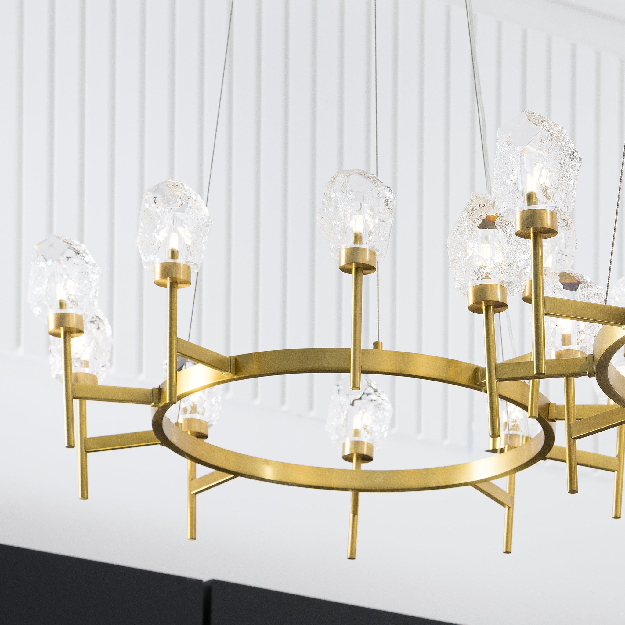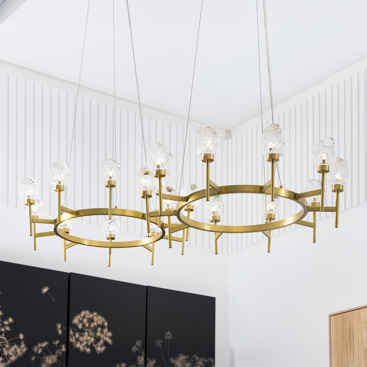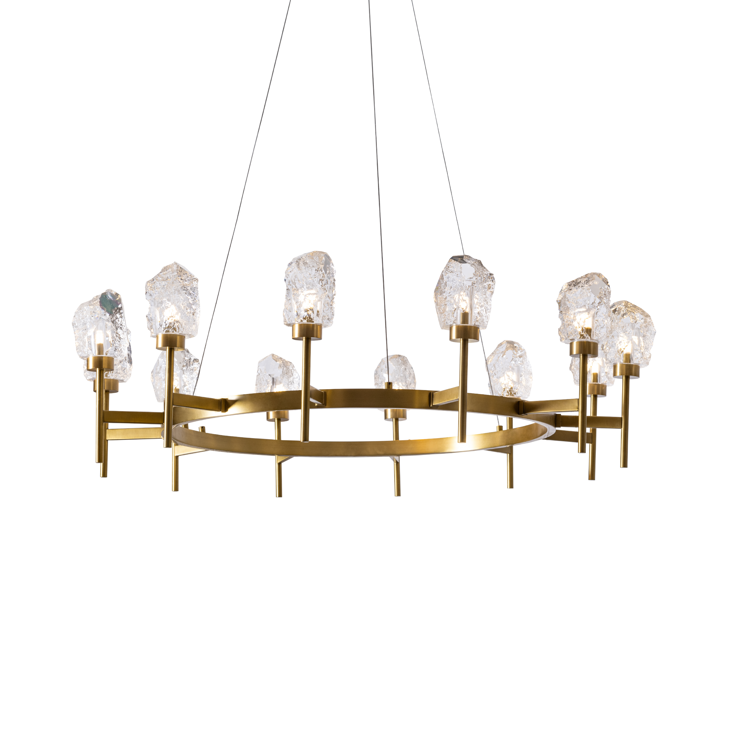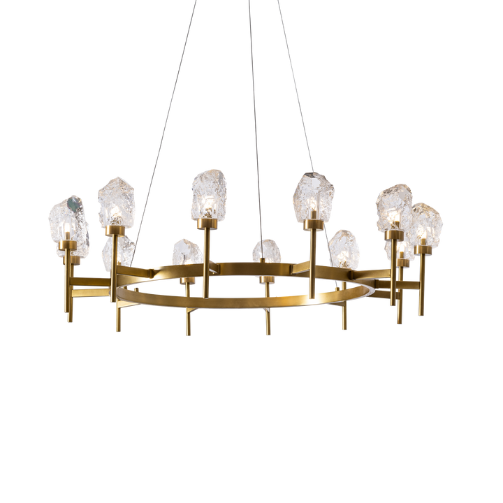 Inspired by the textures of nature, this chandelier brings the look of rough-styled stone into a modern space. It features ten sculpted crystal pieces, each resembling natural rock formations. The antique brass frame offers a sleek contrast to the earthy composition of the crystals.