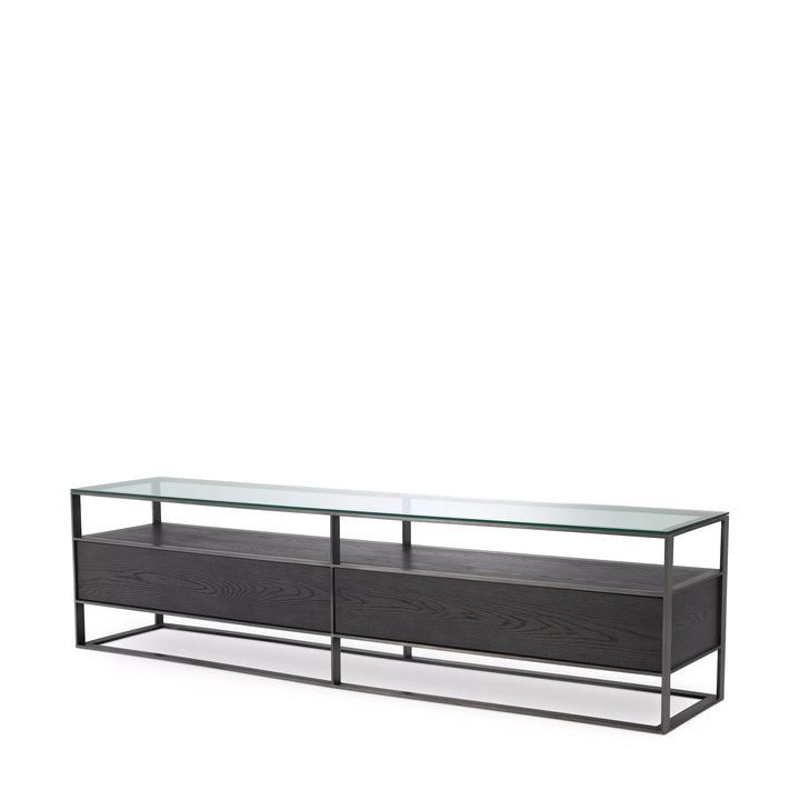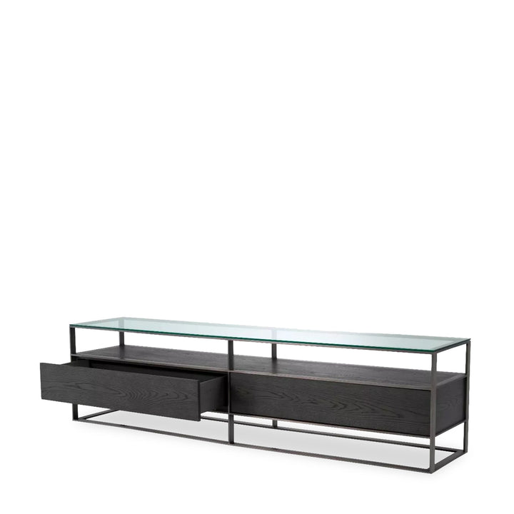 Unmatched industrial looks owned by the TV Cabinet Wagner make it a real contemporary beauty in any modern space. It is crafted in Mocha Oak Veneer with clear glass and medium Bronze finish. Two spacious drawers and a shelf neatly store your gaming elements, remotes, video equipment and more.
