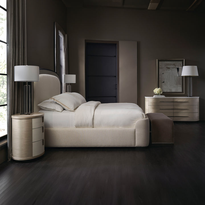 Embark on a journey of contemporary luxury with the Wanderlust King Bedroom Set. Dressed in an extravagant Seal Skin finish, this collection radiates elegance and panache. Enhanced by a UV Linen interior, every aspect exudes refinement. Comprising two sleek cylinder-shaped nightstands, a gracefully contoured chest of drawers, and a luxuriously upholstered bed, this set seamlessly merges comfort with style. Elevate your bedroom ambiance with the Wanderlust King Bedroom Set and immerse yourself in unmatched opulence.
