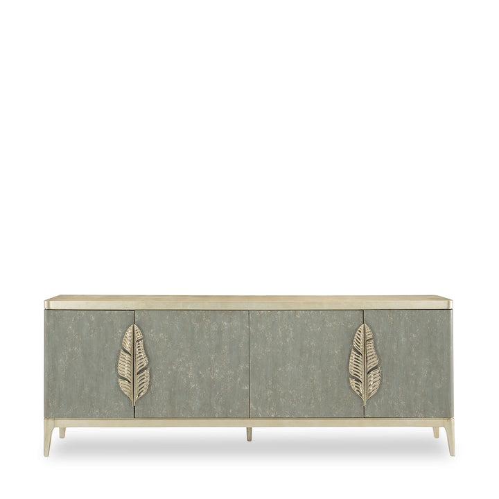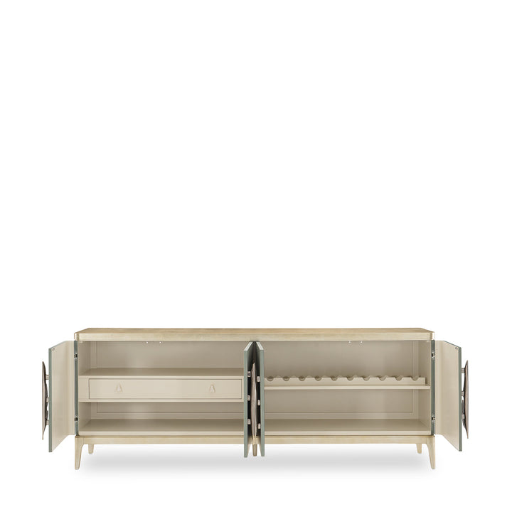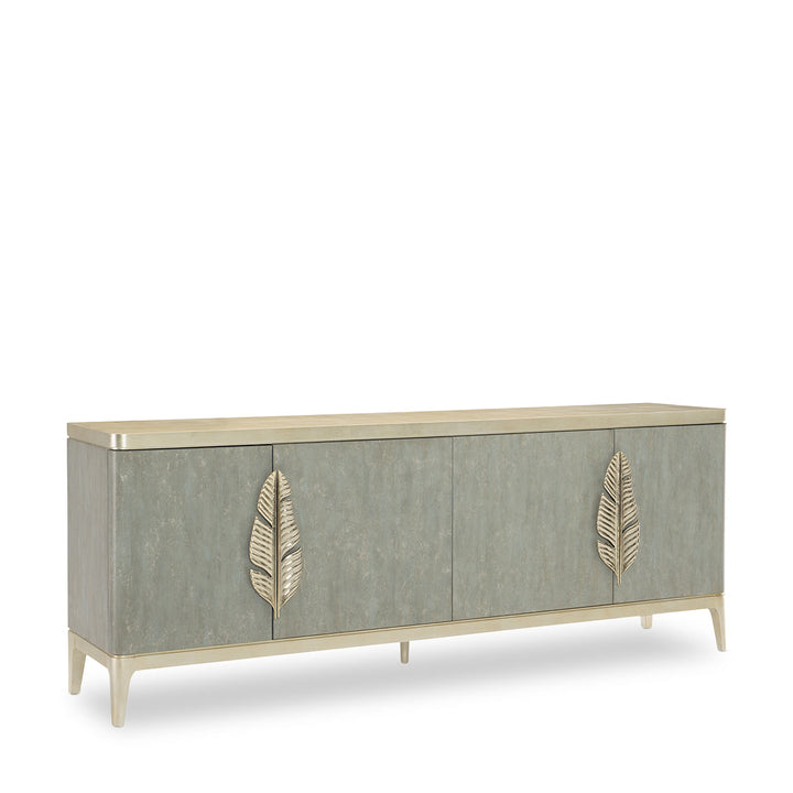 Bring the beauty of the coast indoors with the refreshing charm of this multipurpose console. Created with an impressionistic Tranquil finish in shades of shimmering greyish-blues and soft aquas that mirror the beauty of the sea, its artful appearance creates an instant focal point. A contrasting top and base in Coastal Silver Leaf adds visual dimension. Custom-designed, asymmetrical metallic palm frond door pulls create a memorable accent. Inside the fully finished interior wears a Soft Taupe. Behind the right pair of doors you'll find wine storage while the left side interior offers a drawer and open storage.