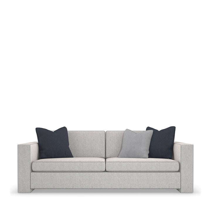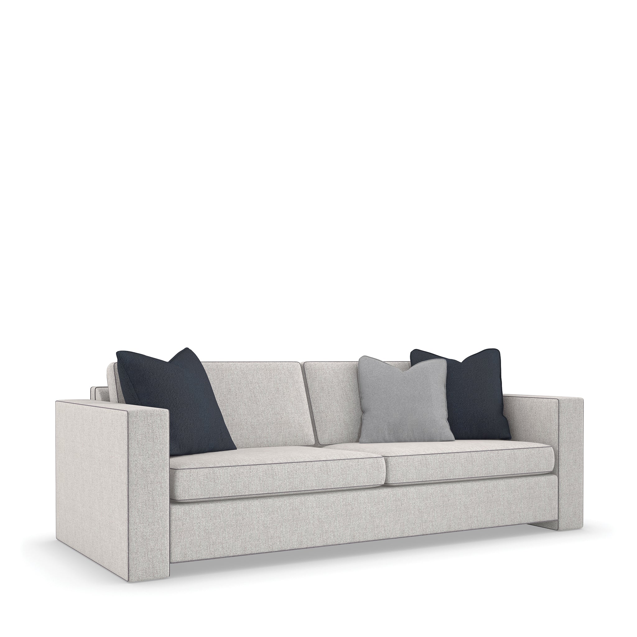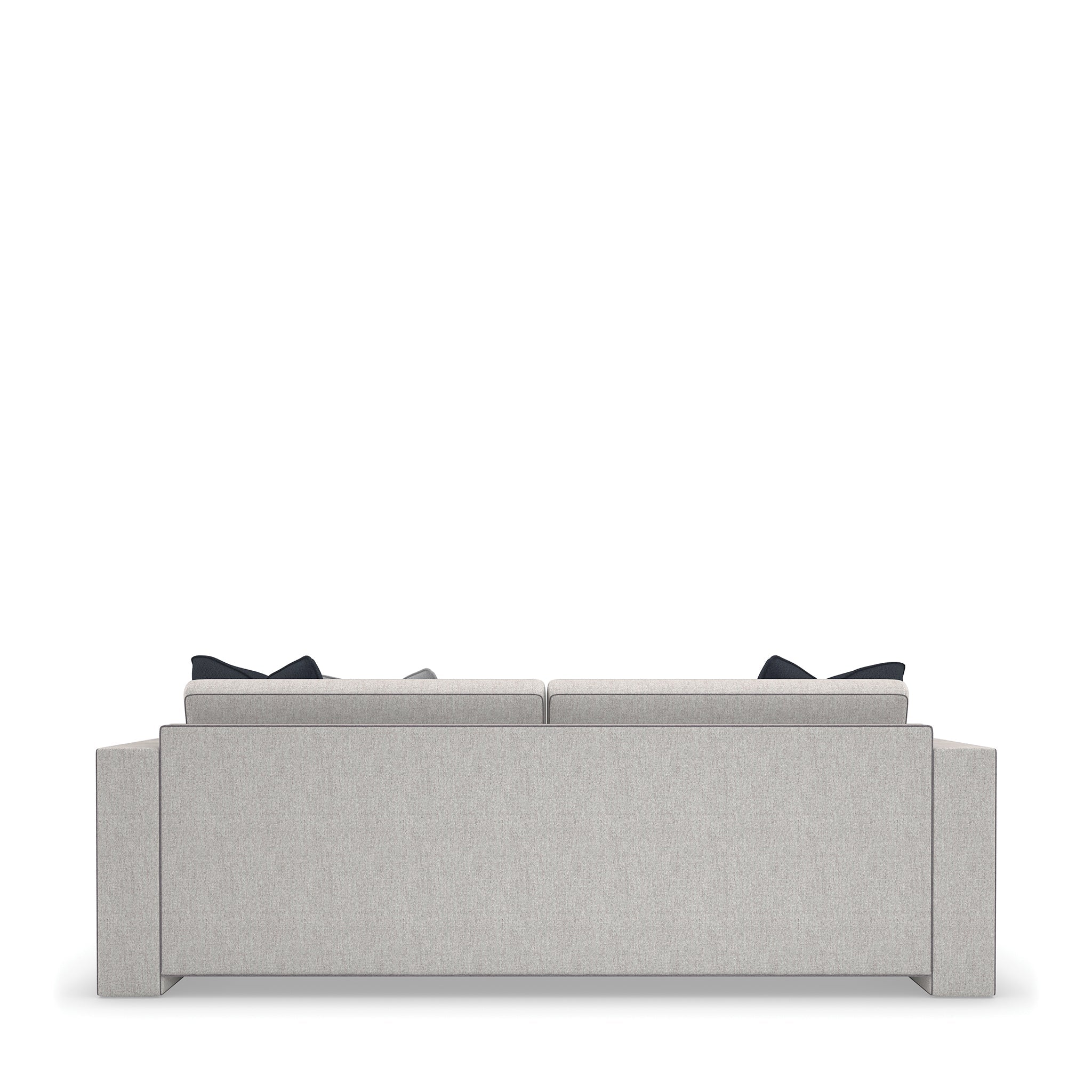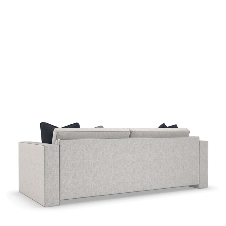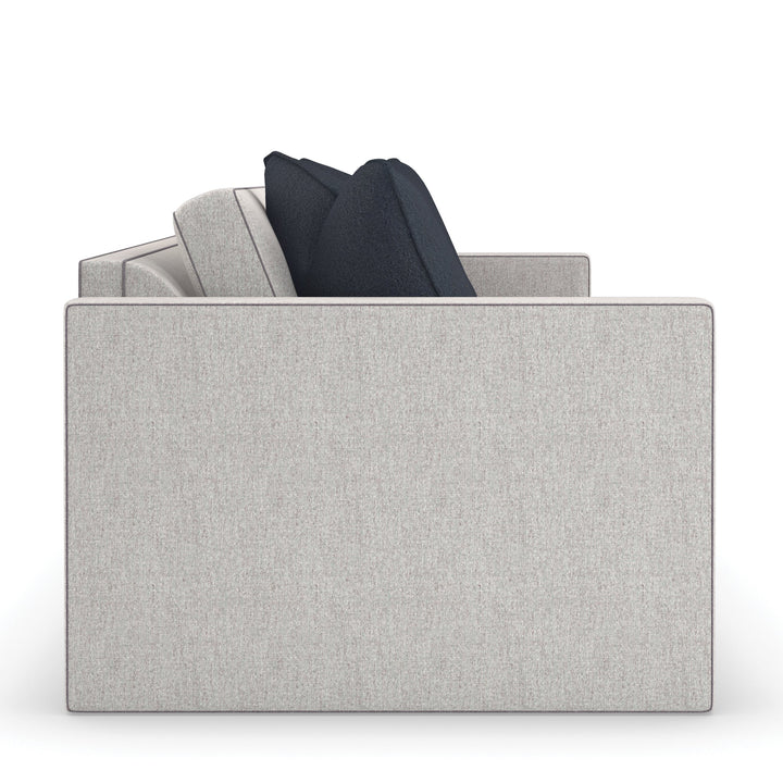 Trendy and comfy, this sofa boasts a fashionable design that will dazzle your guest with its clean aesthetics and ultimate comfort. Brushed Tweed fabric upholstery with Charcoal Billiard fabric welting seamlessly complementing each other. Three cushions in Stone-colored Faux Shearling and Charcoal Billiard fabrics complete the arrangement. This piece will remind you of Paris fashion week and offer contemporary minimalism to your space.
