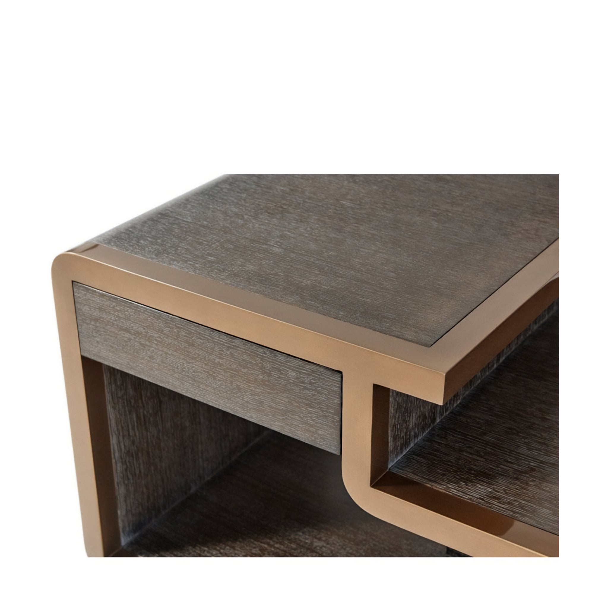 Meet the Wyatt End Table – where style meets function effortlessly! Crafted with Oak Veneer, this Bronze-lacquered beauty adds a touch of glamour to any room. Its two-story top offers ample space for your essentials, while the open, airy shelf below keeps things light and breezy. Whether showcasing decor or serving as a chic sidekick to your sofa, the Wyatt End Table promises sophistication with a modern twist.