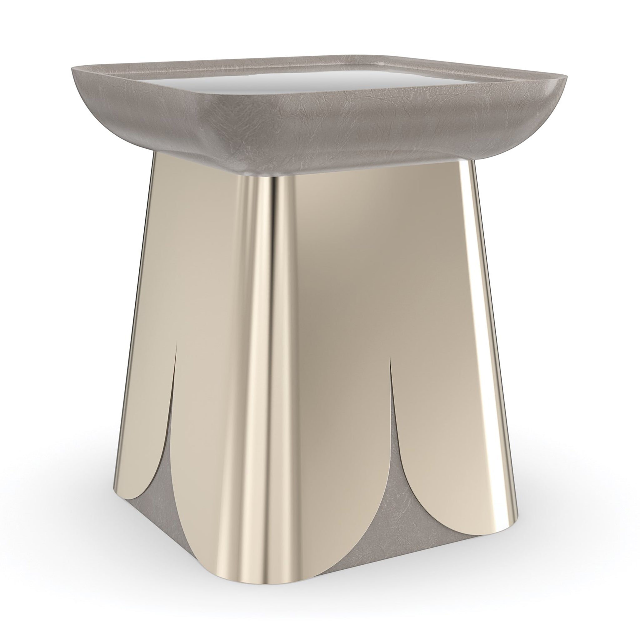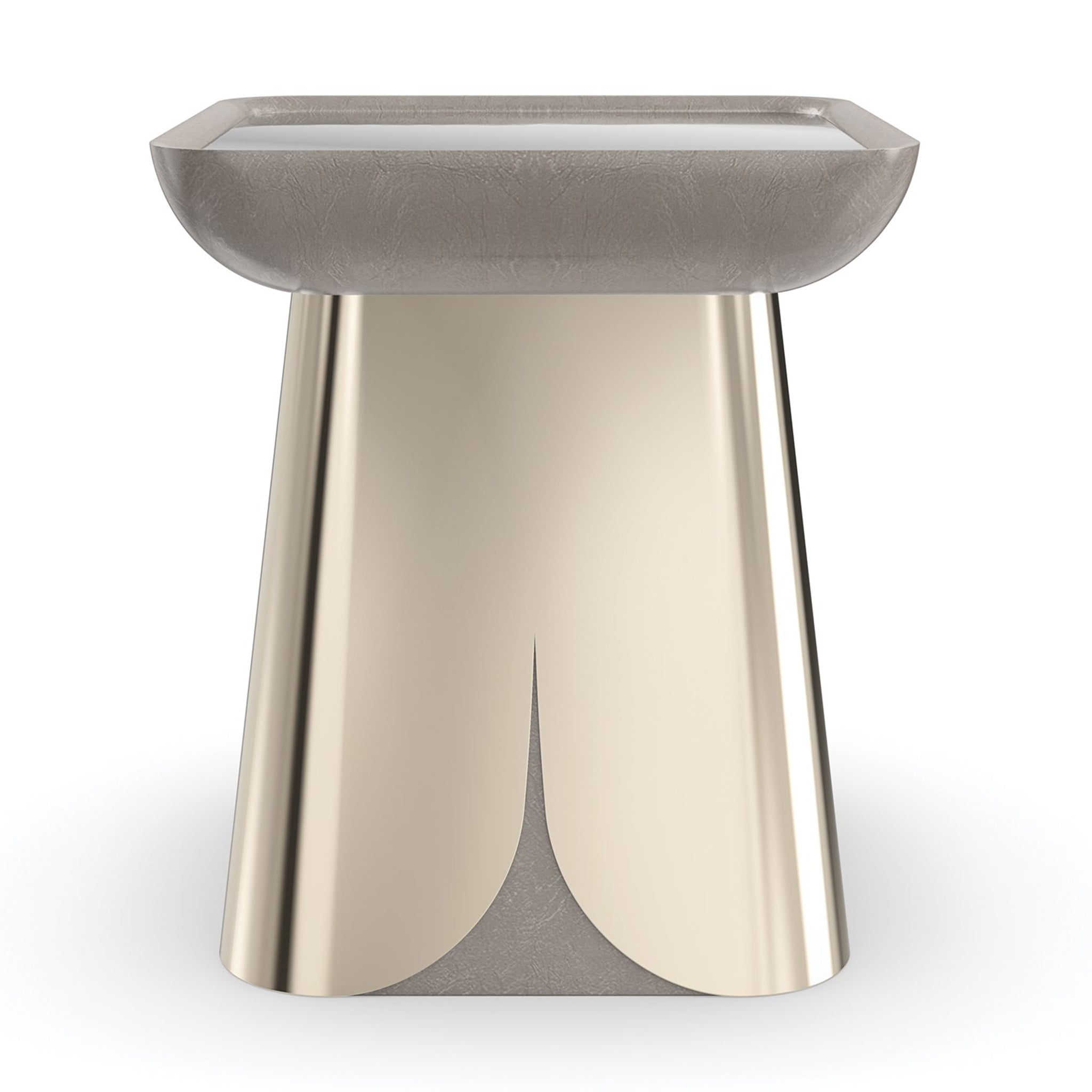 Introducing the Zenith End Table—a beacon of modern elegance! Featuring a trapezoid base and a clear mirror top, it exudes contemporary charm, while the Charcoal Leaf top frame adds a touch of sophistication. The metal base in Whisper of Gold, paired with wood panels finished in Charcoal Leaf, creates a harmonious blend of materials. Elevate your living space with this striking piece that effortlessly combines form and function.