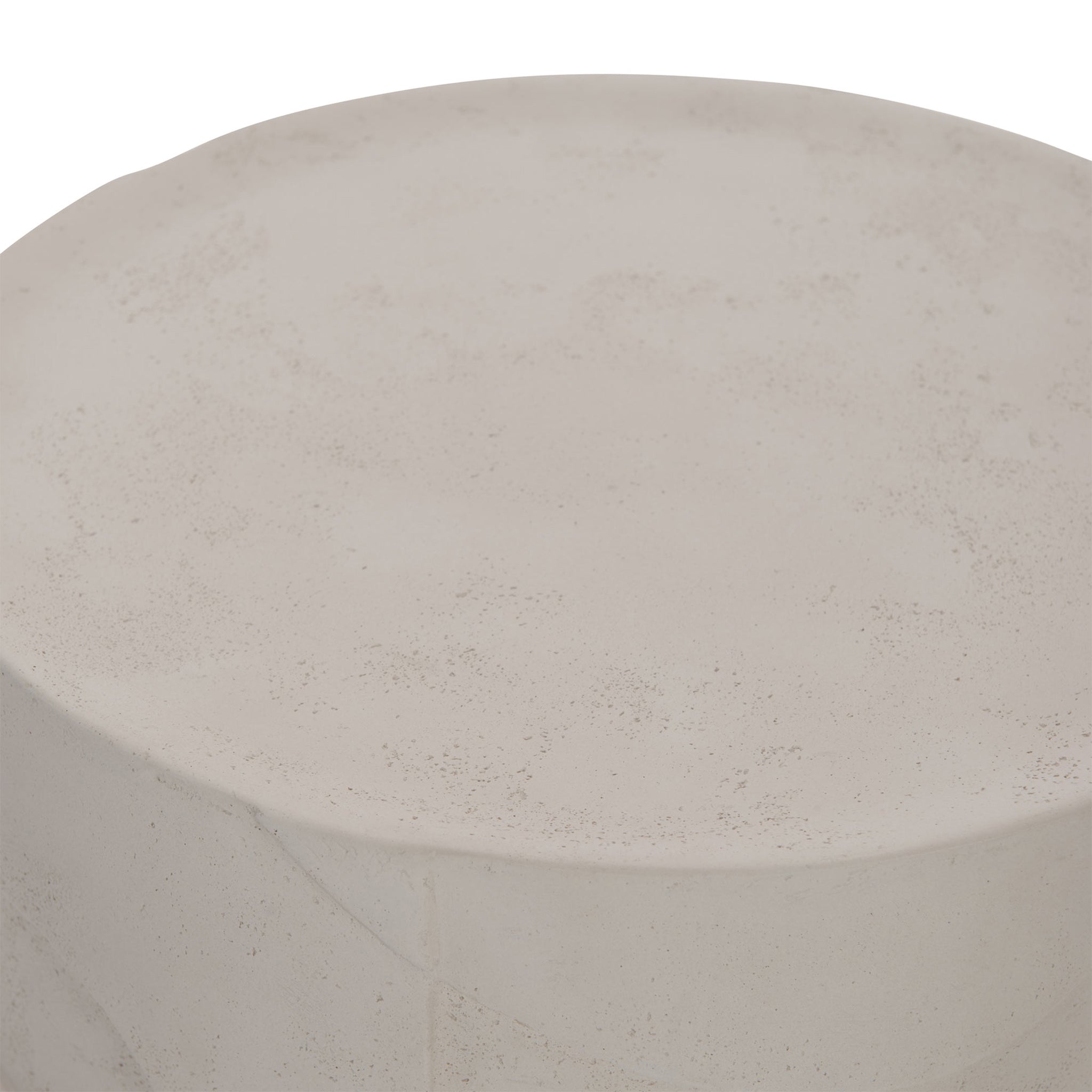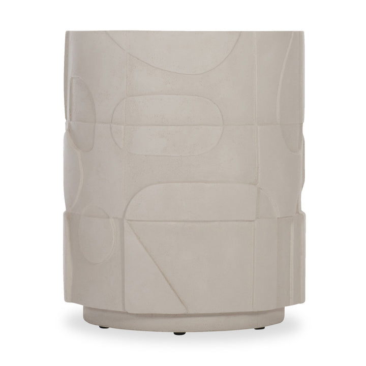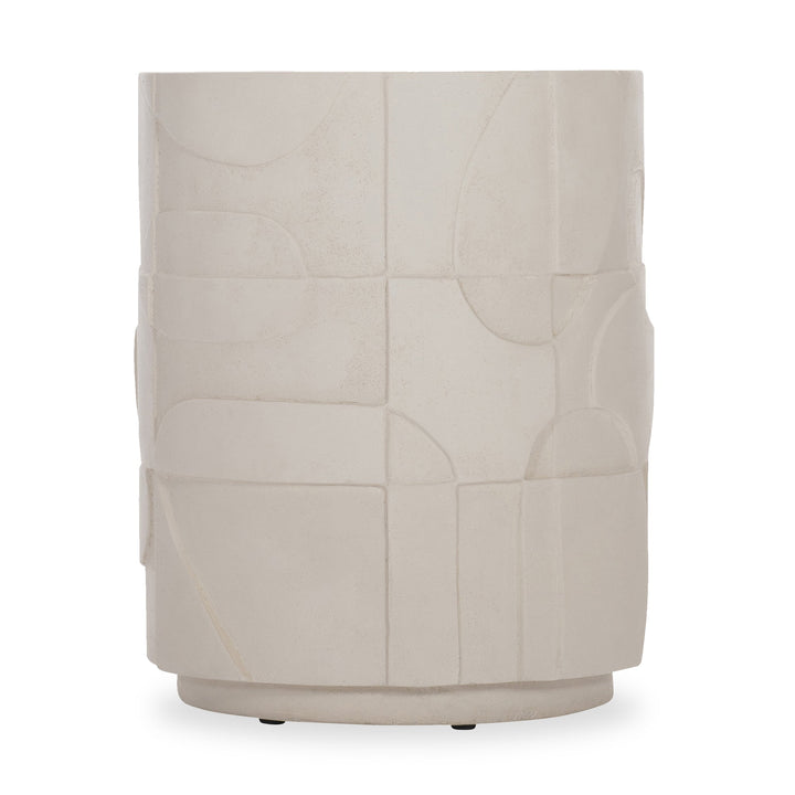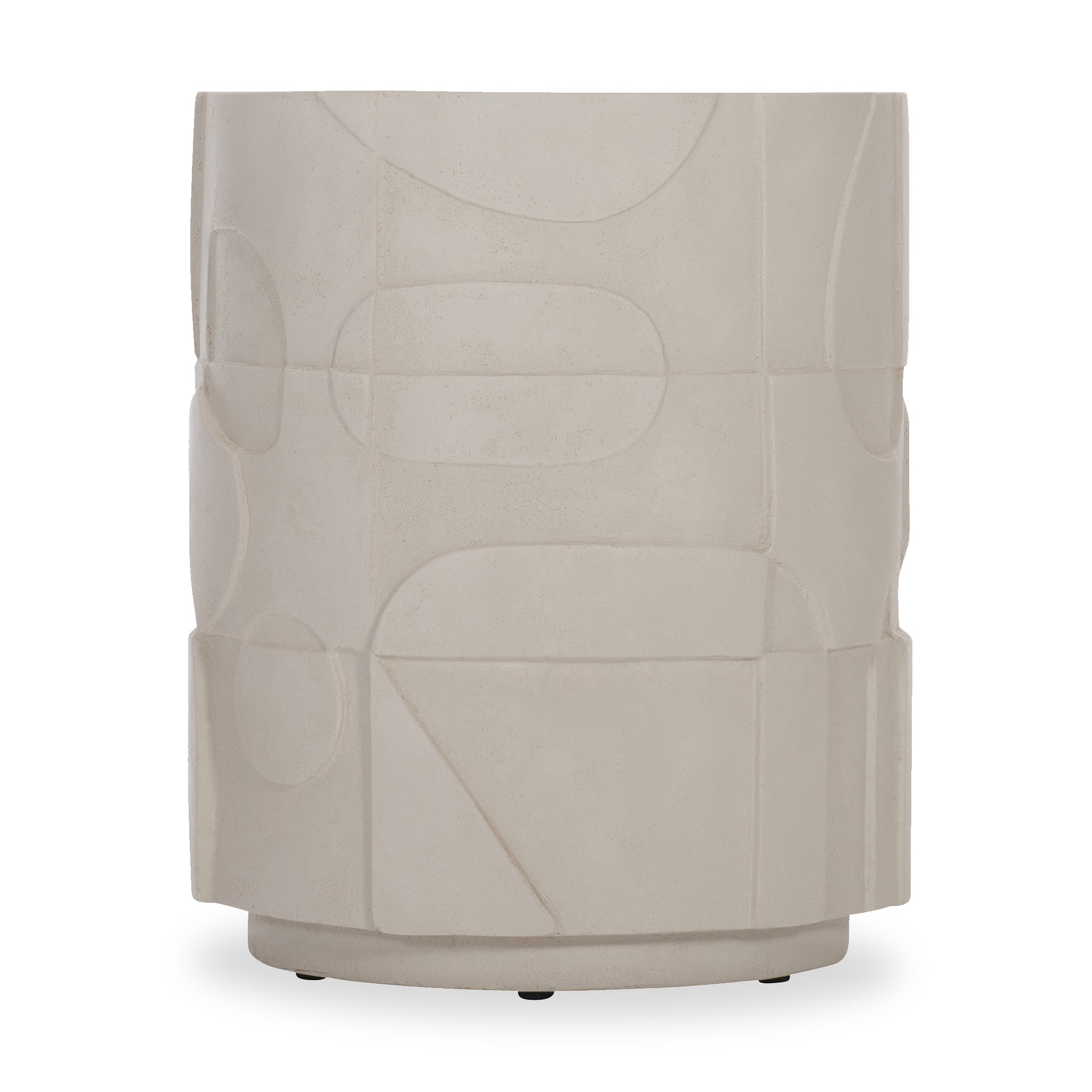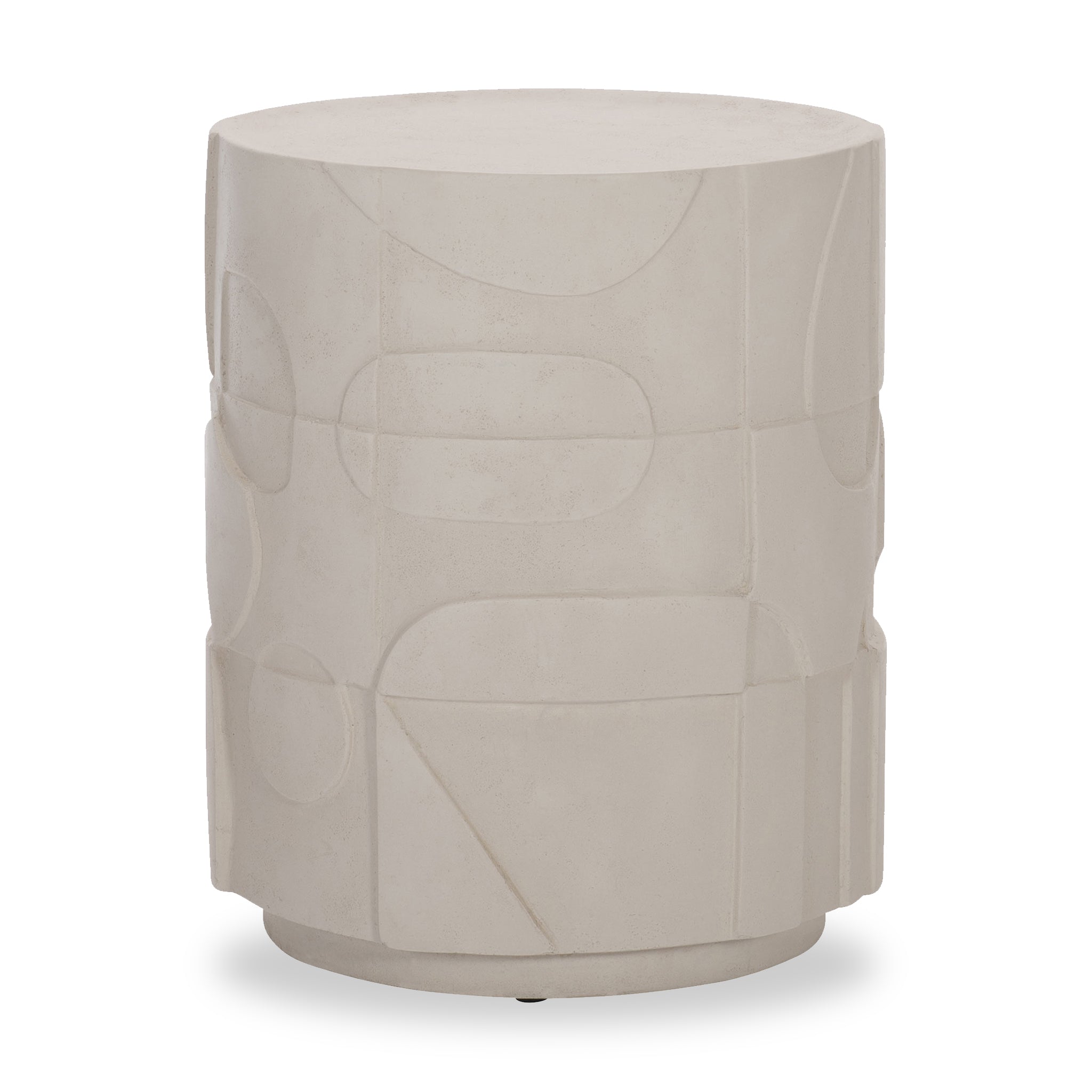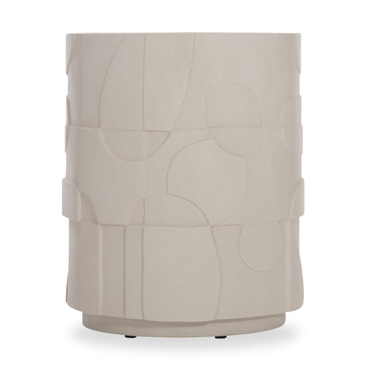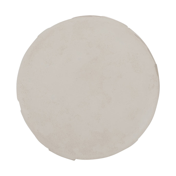 Contemporary and distinguished, the eye-appealing circular profile of the Zina Drink Table suits every modern interior scheme. Cosmetics involve a shallow basin-shaped top and base with dimensional carved organic designs on the sides. The plinth base stands on adjustable black glides.