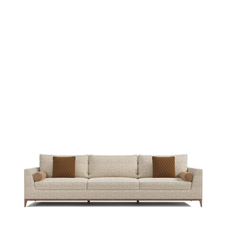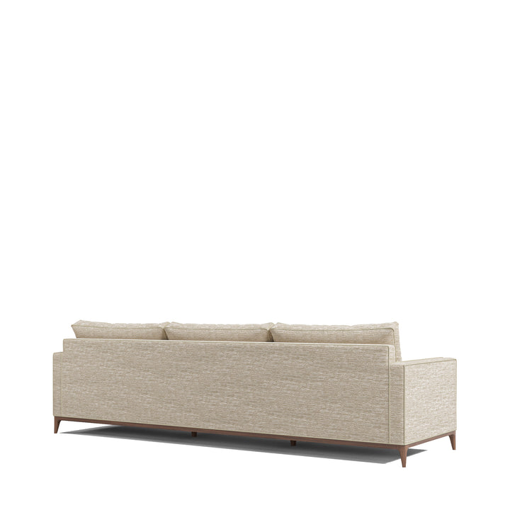 Reflecting the contemporary style, this sofa unites clean geometry with refined comfort. The playa sand dune fabric is beautifully complemented by diamond-quilted cushions that add depth and style. The tapered solid wood base in a midtone walnut finish enhances the design.